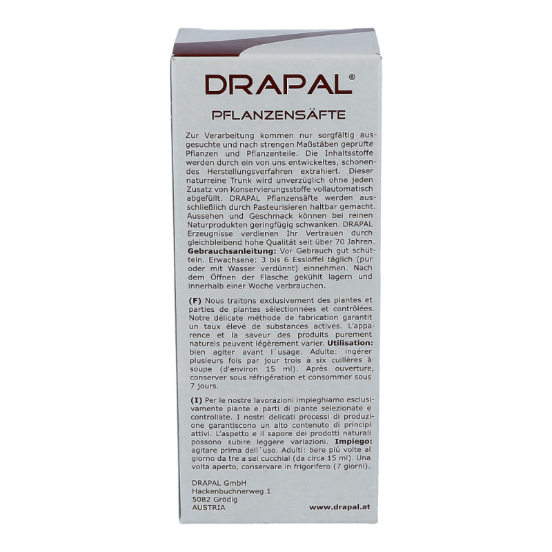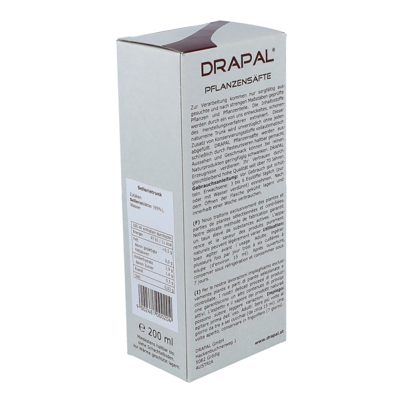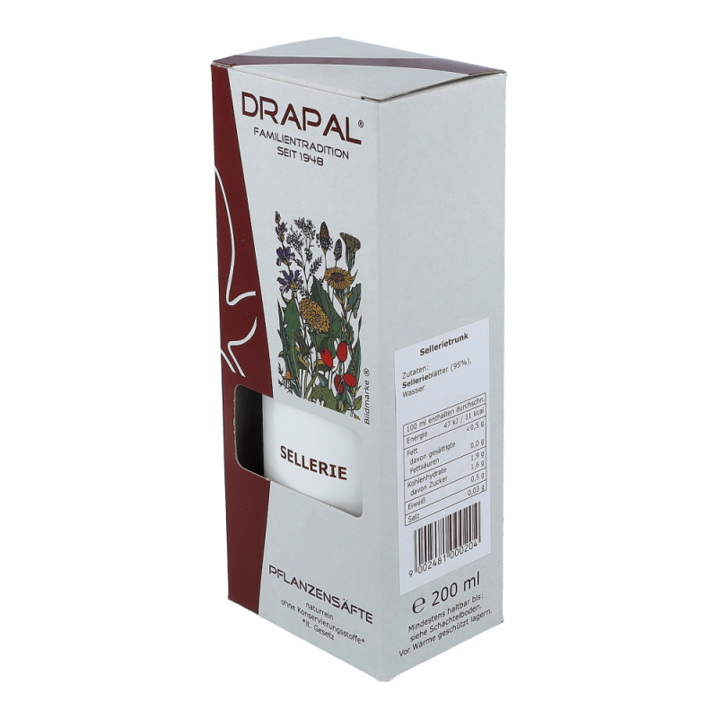 Drapal Sellerie Saft ist zu 100% wirksam und das ganz ohne Chemie. Natürlich ist der Saft auch ohne Konservierungsstoffe, ohne Zuckerzusatz und ohne Alkohol. Reine Natur zum Trinken.