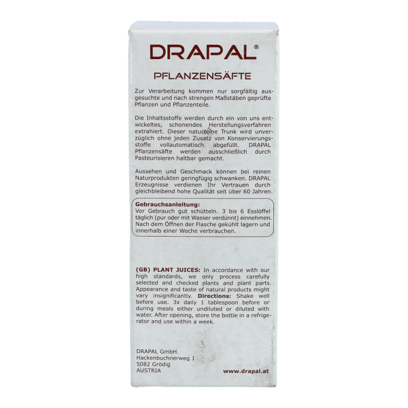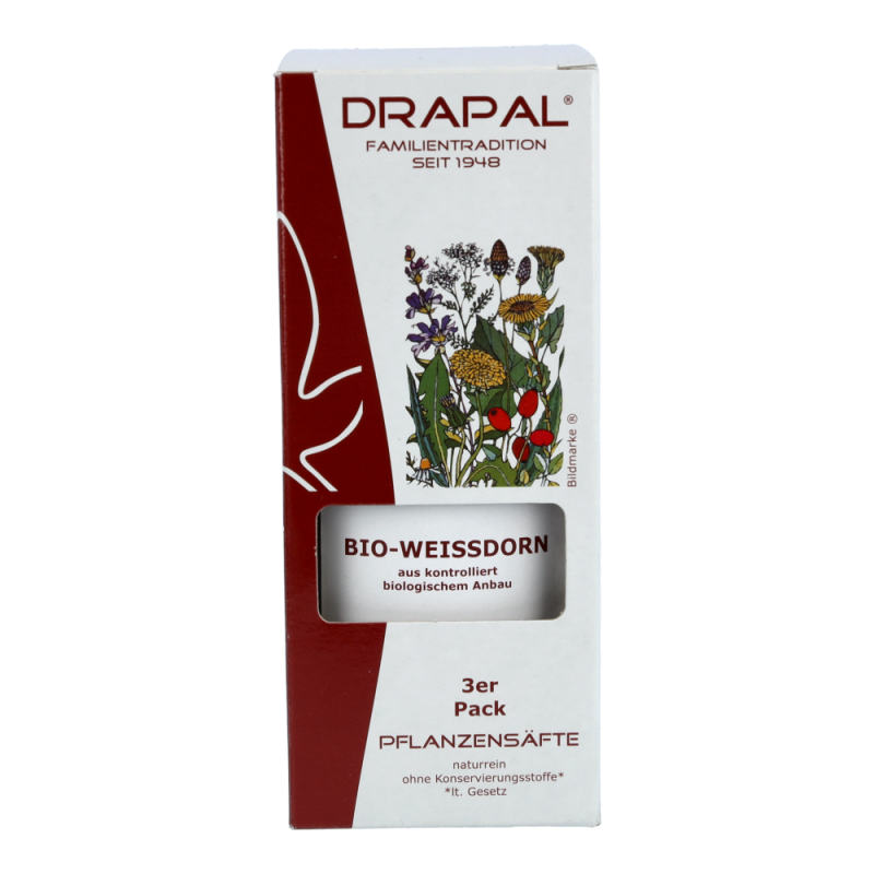 Drapal Weißdorn Saft ist zu 100% wirksam und das ganz ohne Chemie. Natürlich ist der Saft auch ohne Konservierungsstoffe, ohne Zuckerzusatz und ohne Alkohol. Reine Natur zum Trinken. Dieses Produkt erhalten Sie in den Packungsgrößen 200 ml und 600 ml.