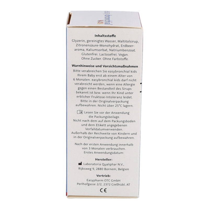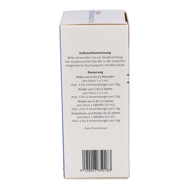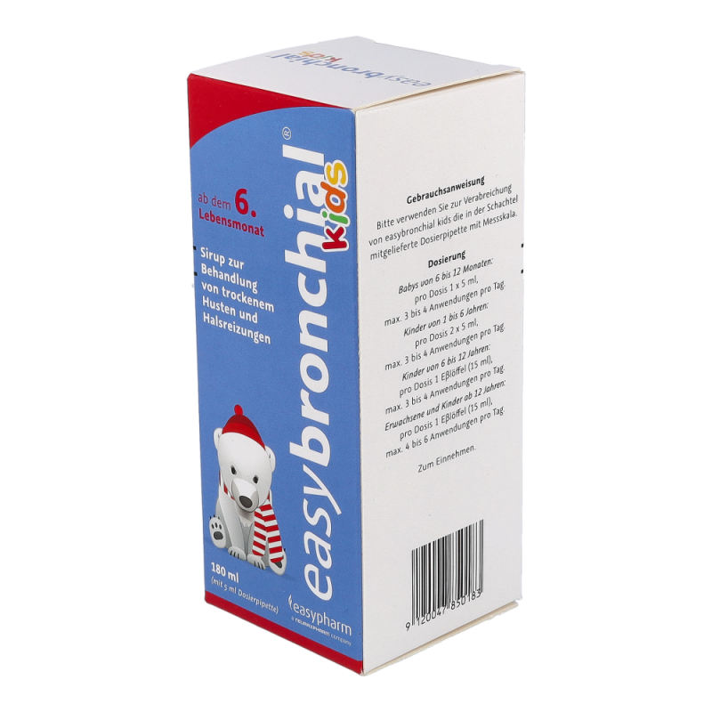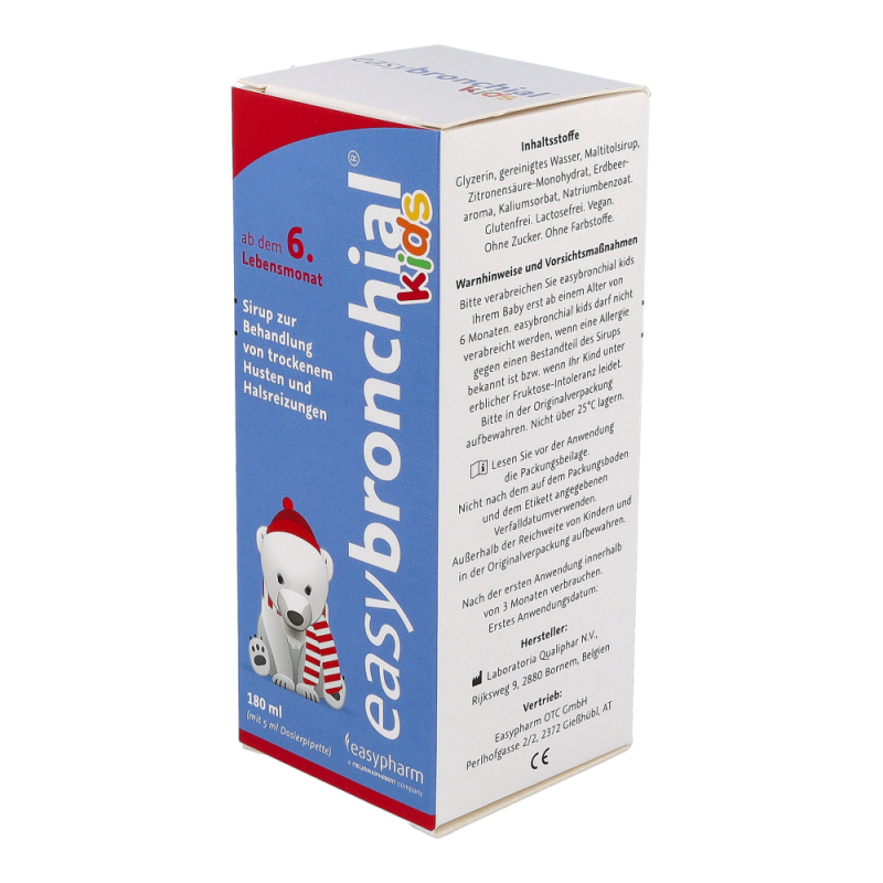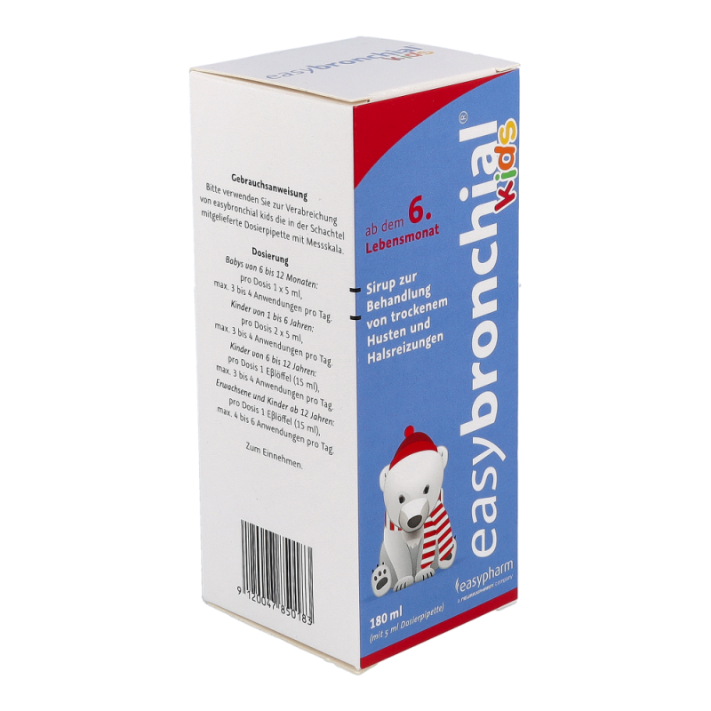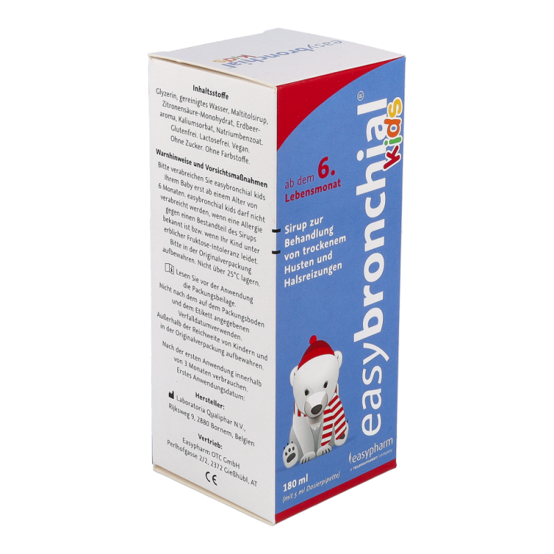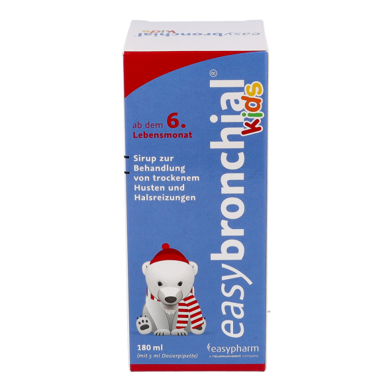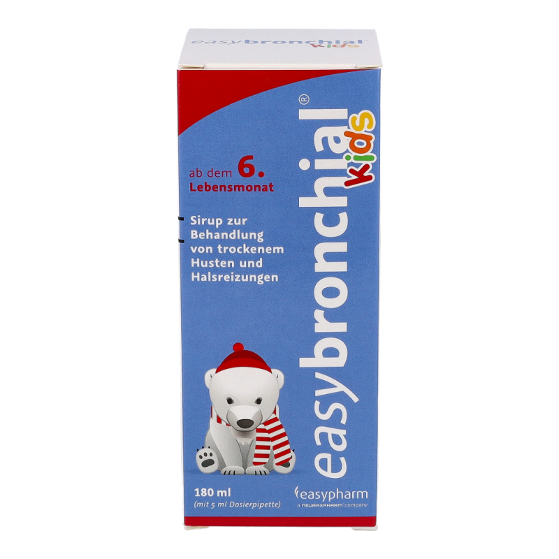 easybronchial® kids ist ein Sirup zur Behandlung von trockenem Husten und Halsreizungen bei Kindern ab dem 6. Monat. Das im Sirup enthaltene Glyzerin bildet einen schützenden Film im gereizten Halsraum, wodurch Husten gestillt und Halsschwellungen sowie -reizungen gelindert werden. Zusätzlich mildert easybronchial® auch Beschwerden bei Halsreizungen, die durch verschiedenen Umwelteinflüsse, wie z.B. trockene Luft, Staub oder Zigarettenrauch, ausgelöst werden.