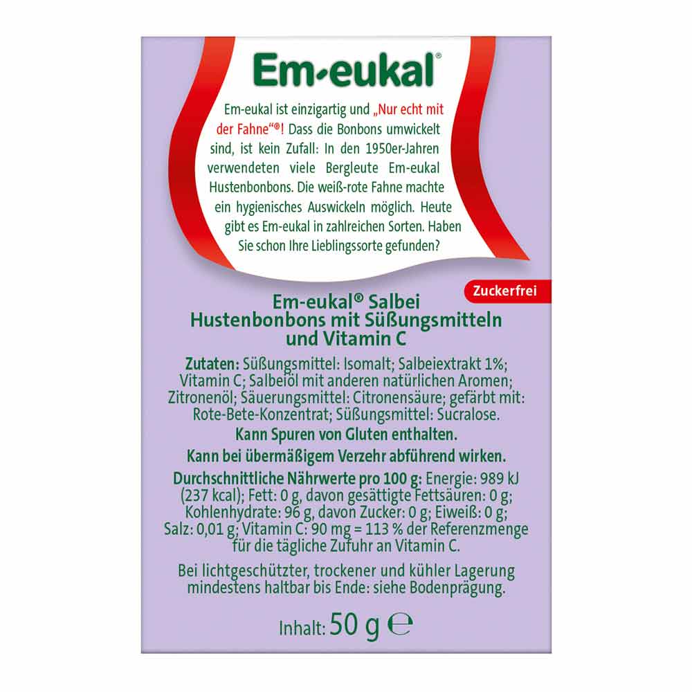 Die Em Eukal Salbei Bonbons sind Premiumbonbons mit wertvollem Salbeiextrakt aus kontrolliertem Anbau und hochwertigen ätherischen Ölen. Sie sind samtig weich im Geschmack und ein natürlicher Balsam für Hals und Stimme.