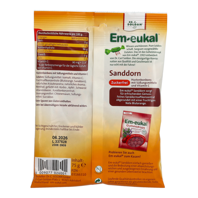 Em-eukal Sanddorn Hustenbonbon zuckerfrei mit der ganz besonderen Geschmacksnote Sanddorn angereichert mit einem aromatischen Hauch von Blutorange. Besonders wertvoll durch den reichhaltigen Vitaminkomplex.