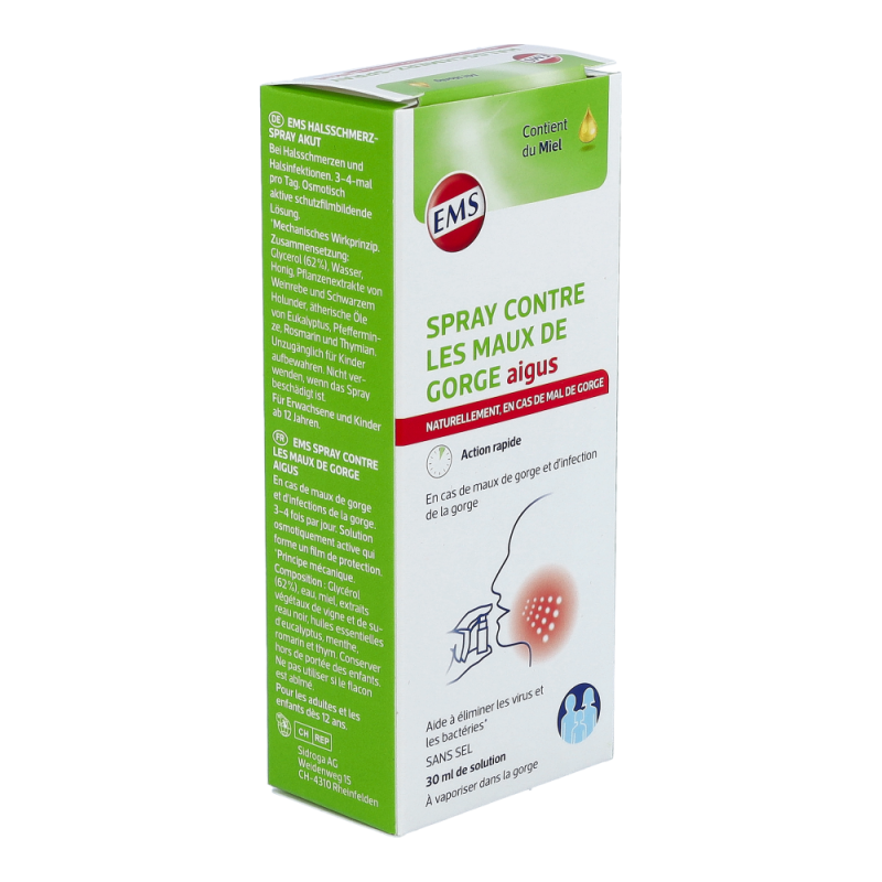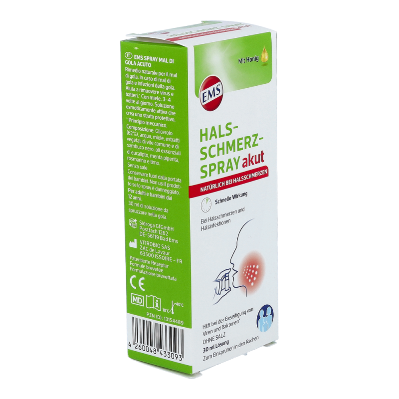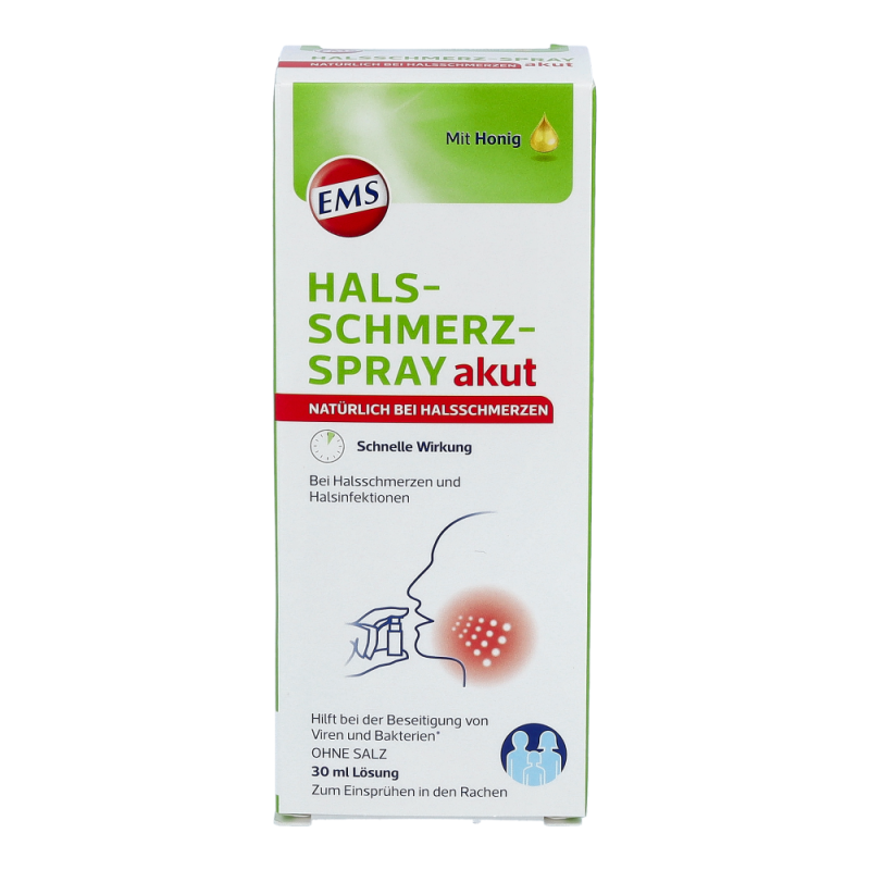 Das EMS Halsschmerz-Spray akut unterstützt durch den Einsatz natürlicher physikalischer Kräfte die Linderung von Halsschmerzen und wirkt gegen Halsinfektionen. Dabei bedient es sich der osmotischen Eigenschaften seiner speziellen Rezeptur. Durch dessen Einsatz bildet sich ein Flüssigkeitsstrom, der Viren und Bakterien aus dem Hals herausspült. Gleichzeitig legt sich das Spray wie ein Schutzfilm auf die gereizte Schleimhaut. Auf diese Weise können Halsinfektionen effektiv behandelt – und Halsschmerzen gelindert werden..