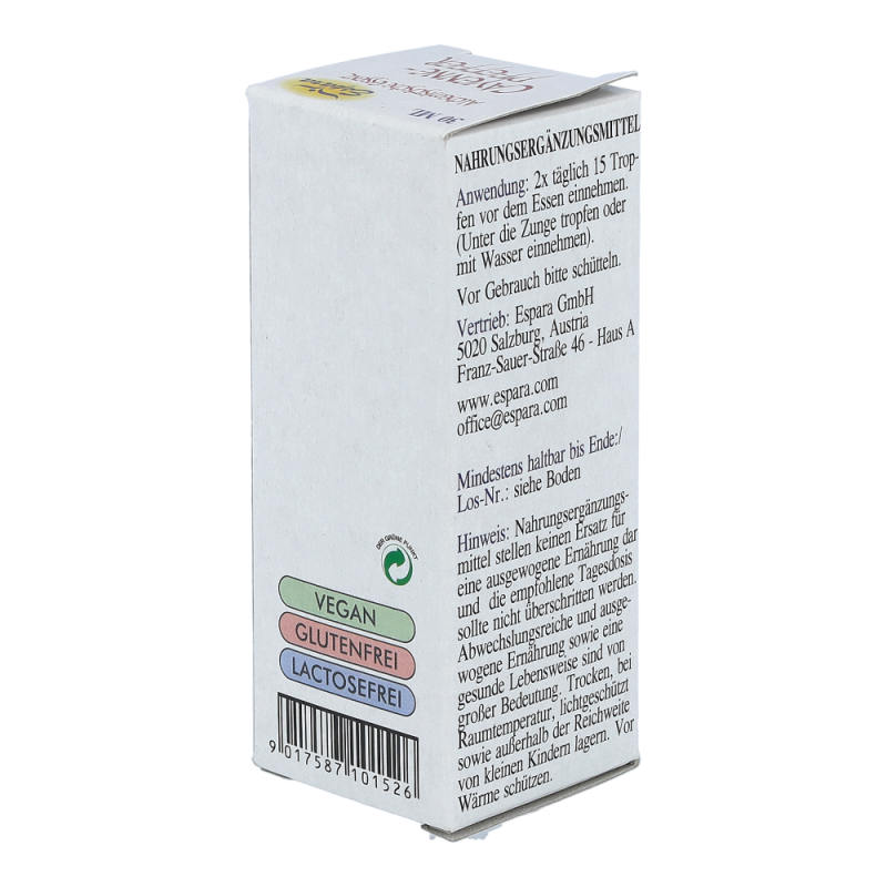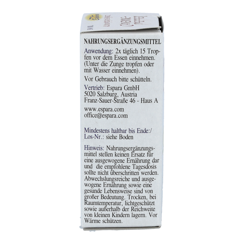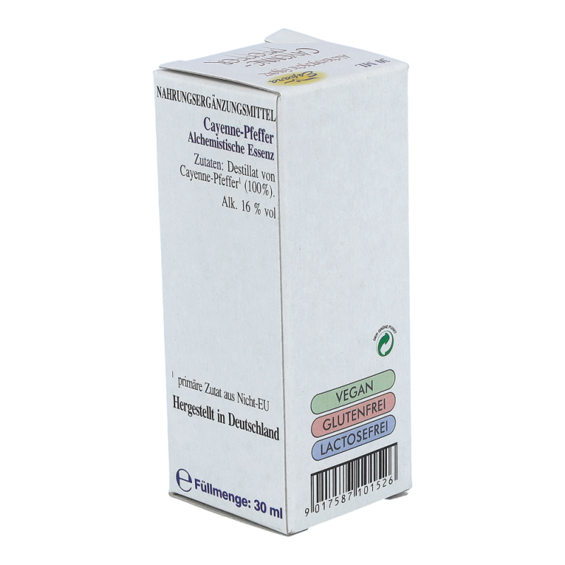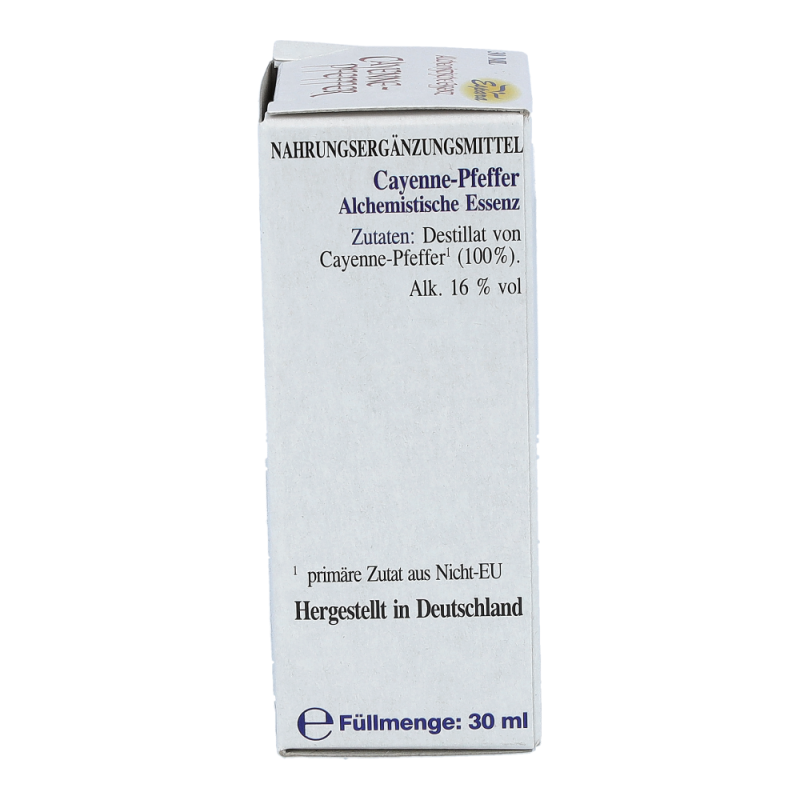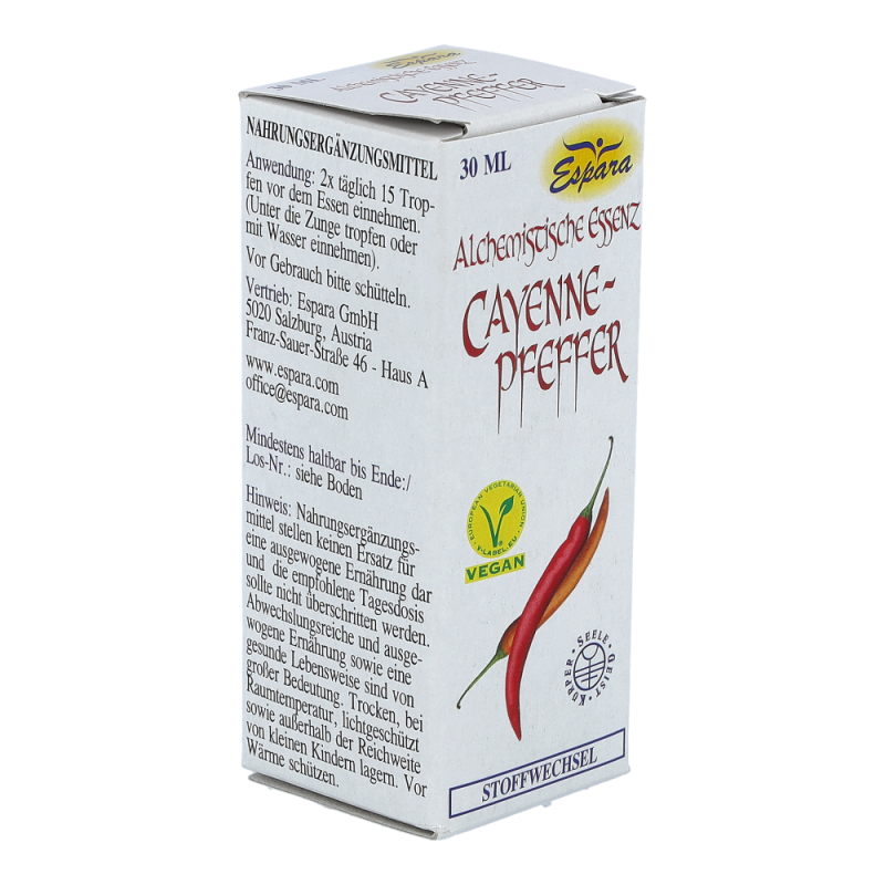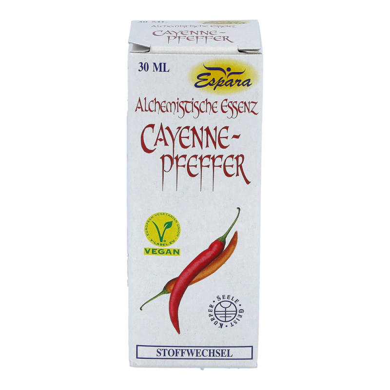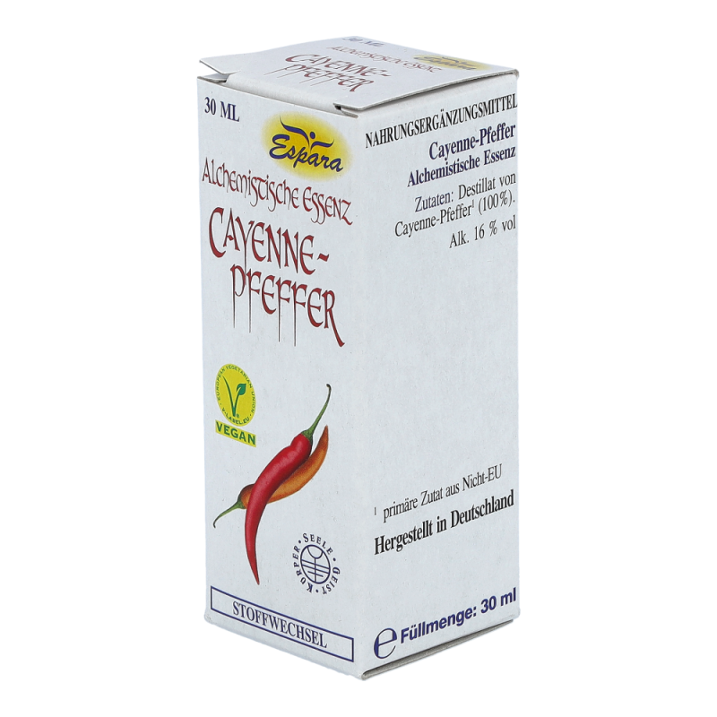 Espara Alchemistische Essenz Cayenne Pfeffer ist ein Nahrungsergänzungsmittel mit Cayenne-Pfeffer-Destillat. Hergestellt nach einem speziellen, auf Paracelsus zurückgehenden Verfahren.