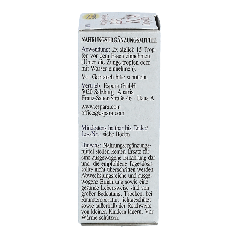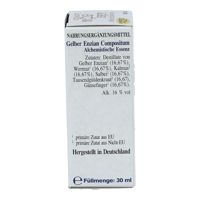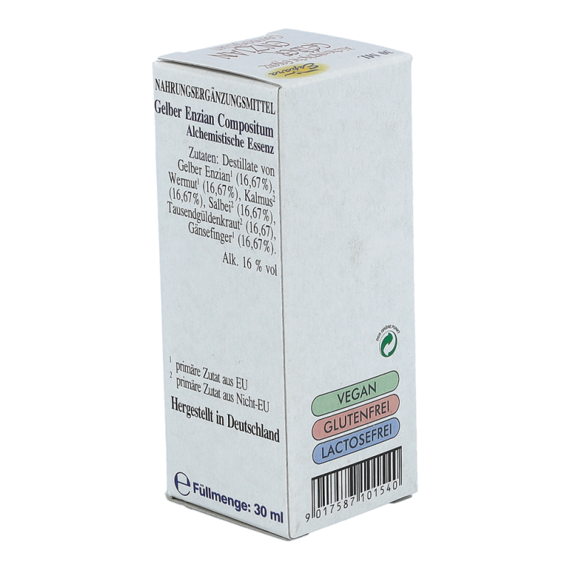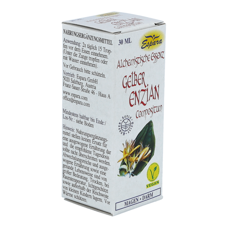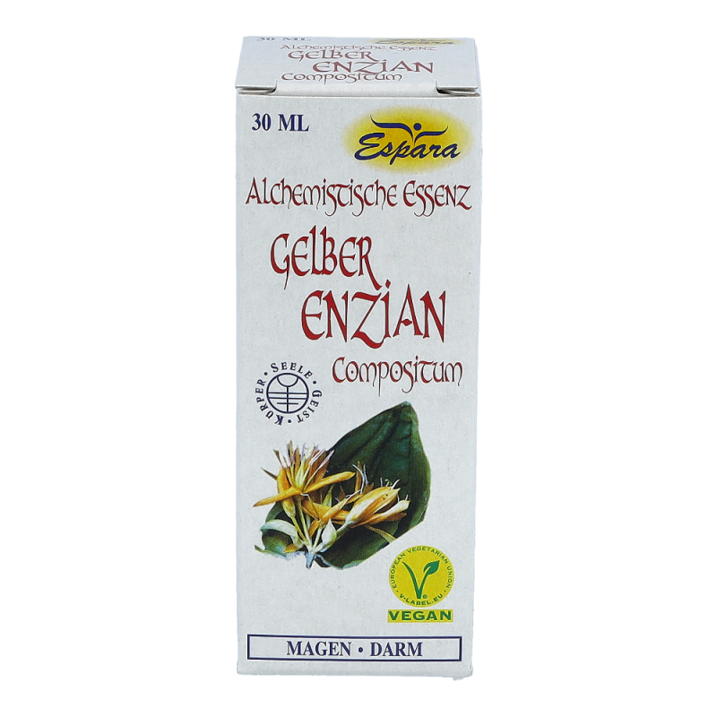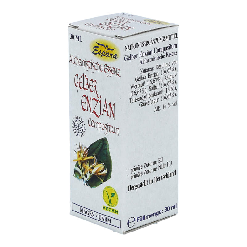Espara Alchemistische Essenz Gelber Enzian Compositum ist ein Nahrungsergänzungsmittel mit Destillaten von Gelber Enzian, Wermut, Kalmus, Salbei, Tausendgüldenkraut und Gänsefinger. Gelber Enzian ist für seine positiven Wirkungen auf Magen und Darm bekannt. Hergestellt nach einem speziellen, auf Paracelsus zurückgehenden Verfahren.