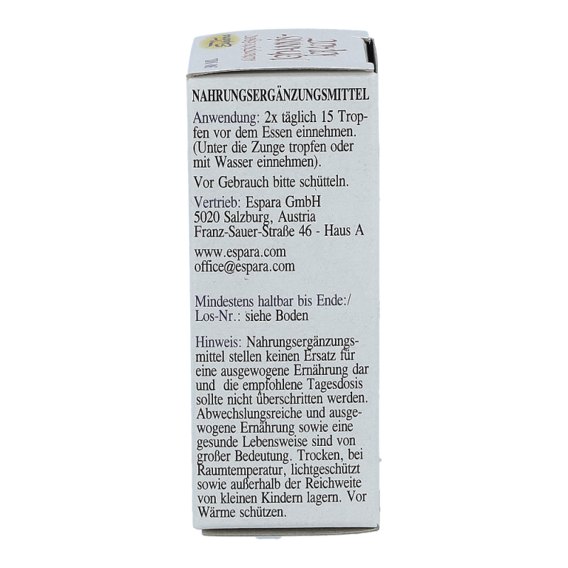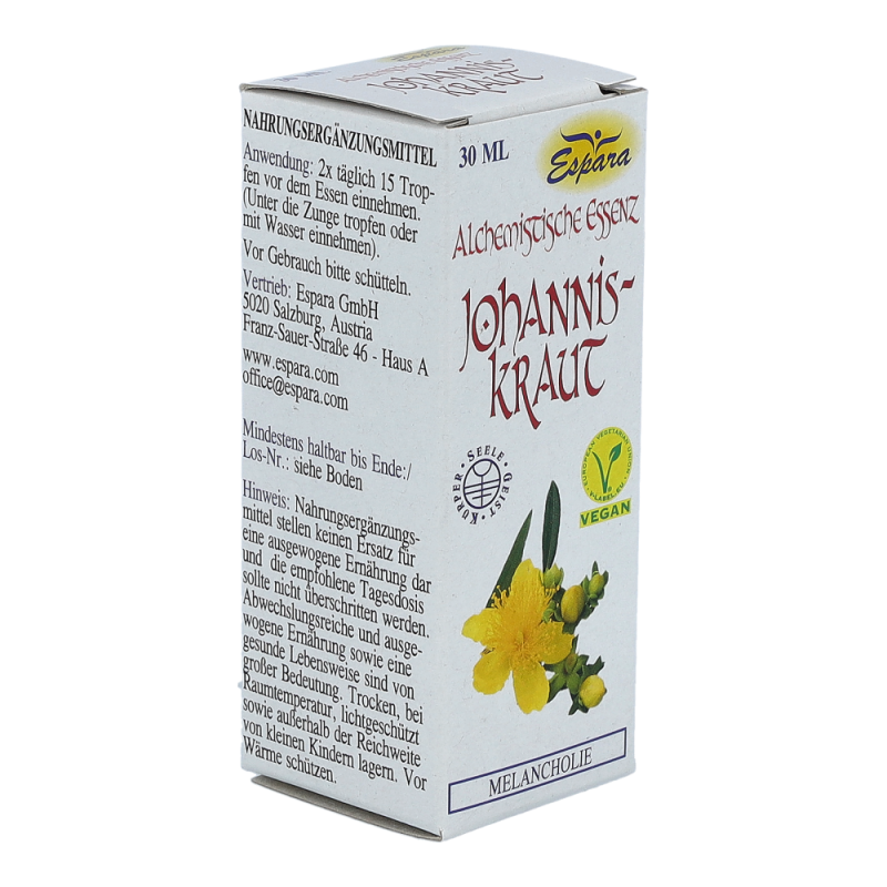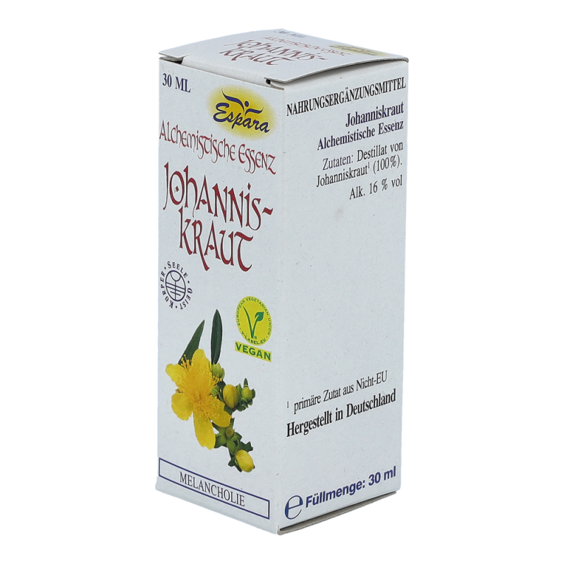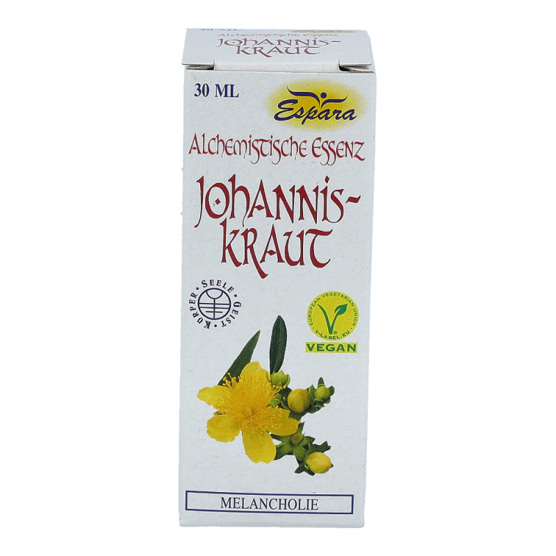 Espara Alchemistische Essenz Johanniskraut ist ein Nahrungsergänzungsmittel mit Johanniskraut-Destillat. Johanniskraut ist bekannt für seine stimmungsaufhellenden Eigenschaften. Hergestellt nach einem speziellen, auf Paracelsus zurückgehenden Verfahren.