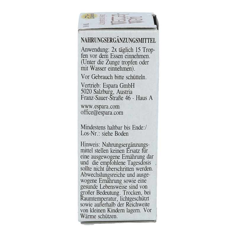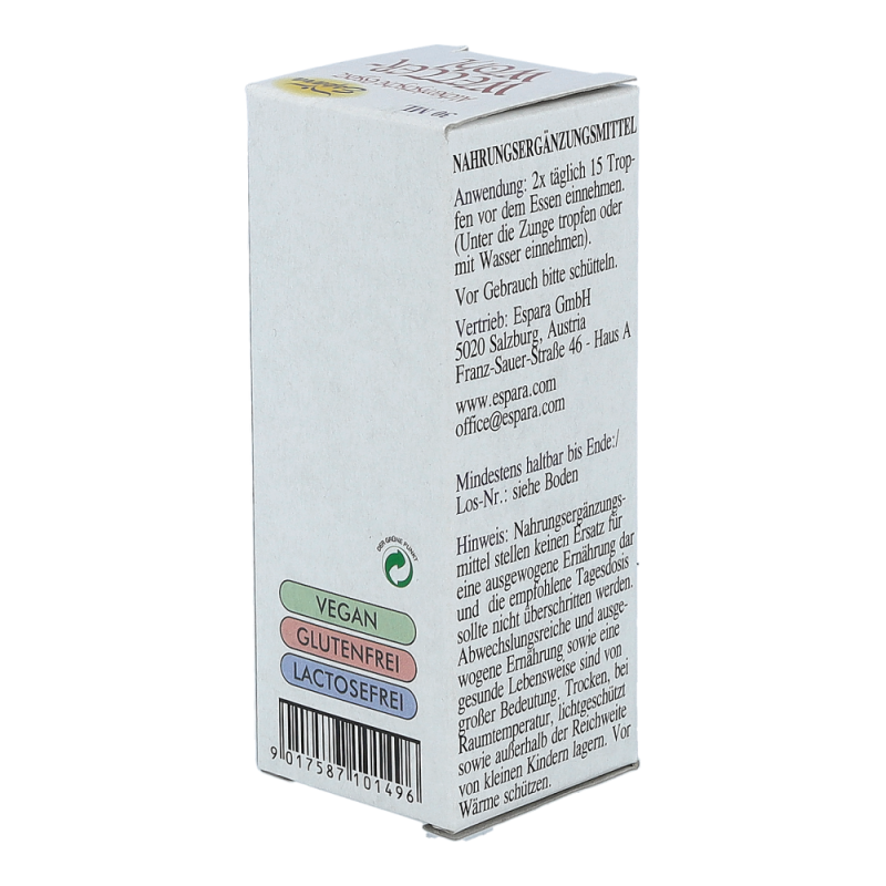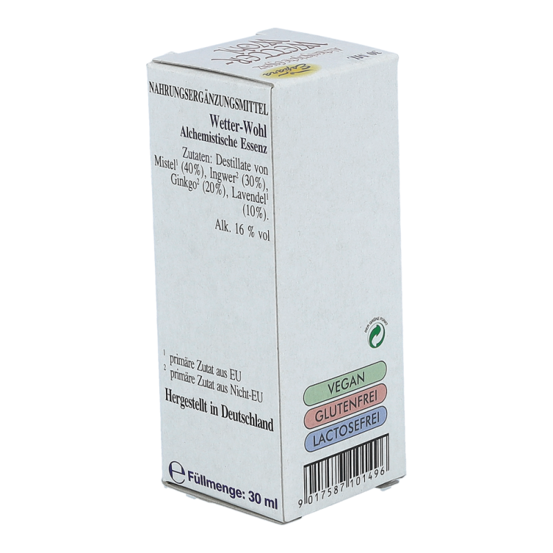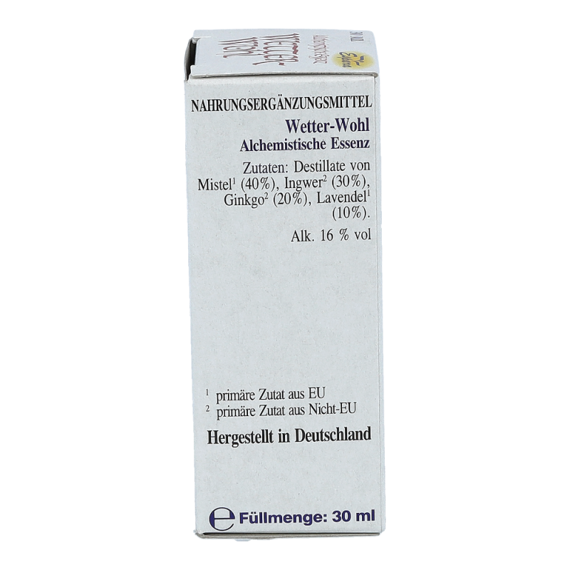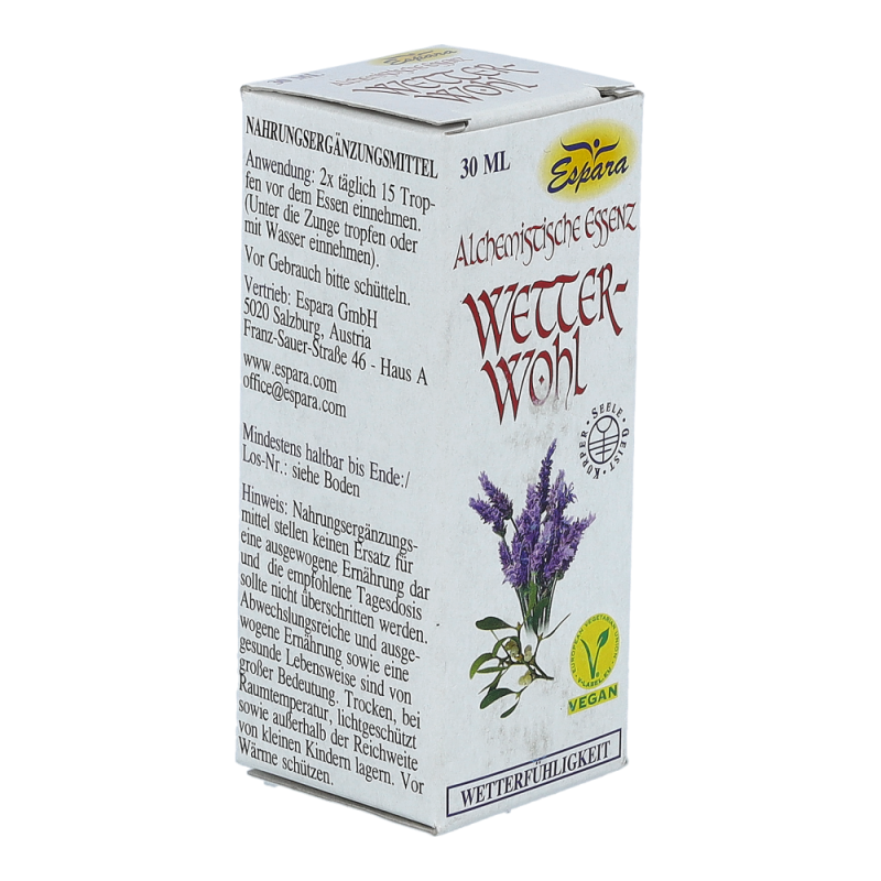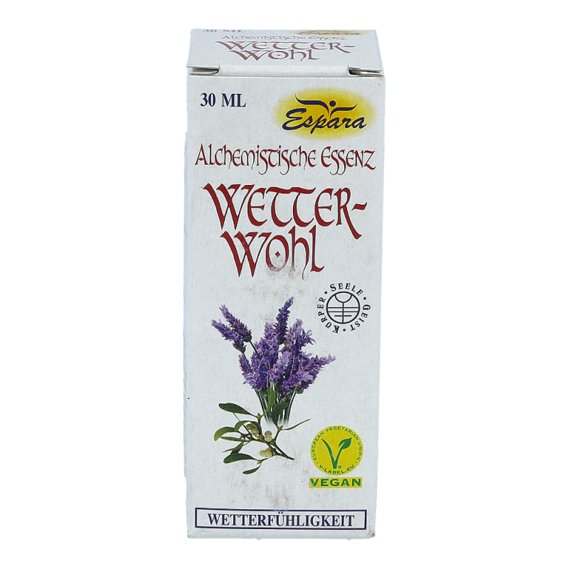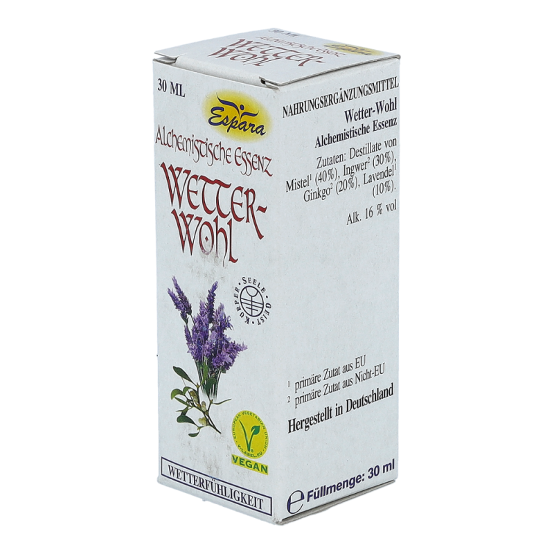 Espara Alchemistische Essenz Wetter-wohl ist ein Nahrungsergänzungsmittel mit Destillaten von Mistel, Ingwer, Ginkgo und Lavendel. Hergestellt nach einem speziellen, auf Paracelsus zurückgehenden Verfahren.