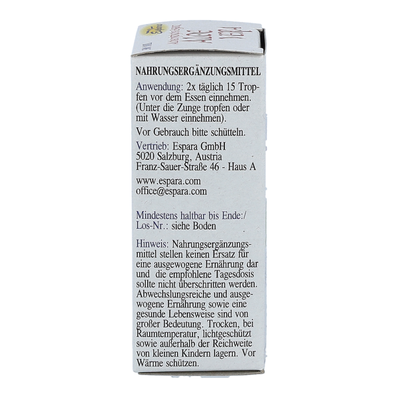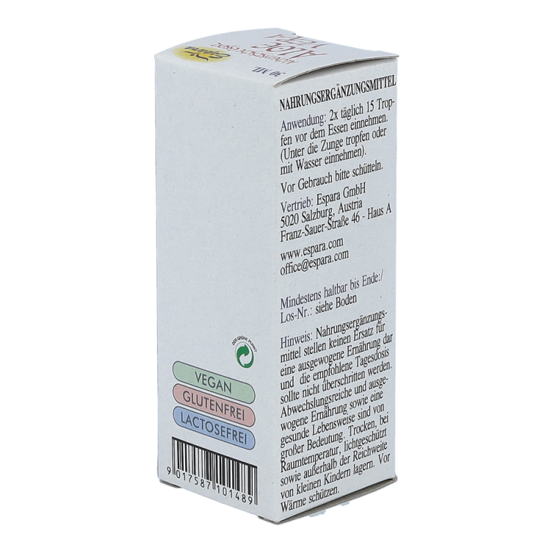 2 x täglich 15 Tropfen vor dem Essen einnehmen (unter die Zunge tropfen oder mit Wasser einnehmen).