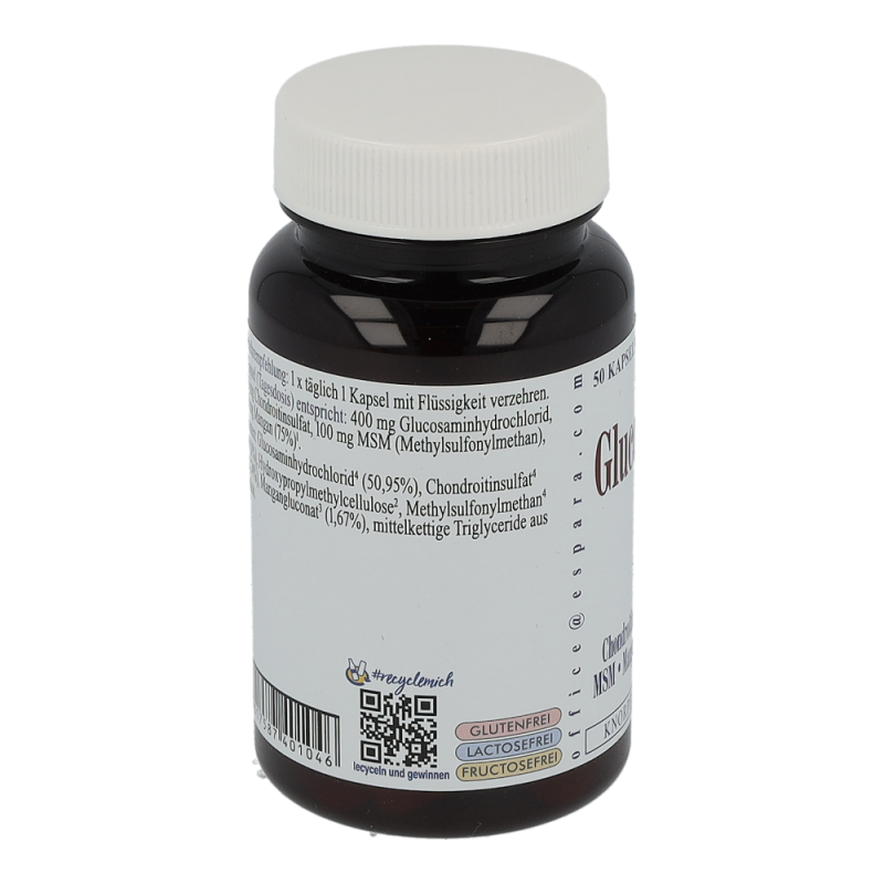 Glucosaminhydrochlorid (50,95%), Chondroitinsulfat (19,11%), Hydroxypropylmethylcellulose*, Methylsulfonylmethan (12,74%), Mangangluconat (1,67%), mittelkettige Triglyceride aus Kokos. *pflanzliche Kapselhülle