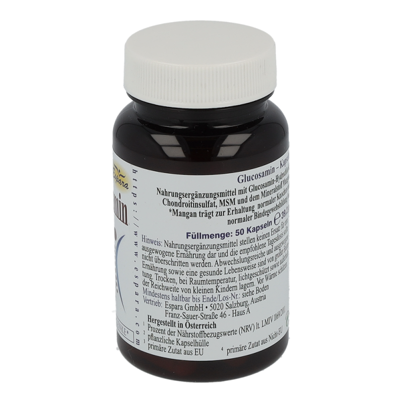 Nahrungsergänzungsmittel mit Glucosamin-Hydrochlorid, Chondroitinsulfat, MSM und dem Mineralstoff Mangan. Mangan trägt zur Erhaltung normaler Knochen und normaler Bindegewebsbildung bei.