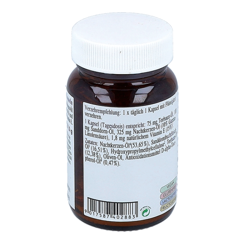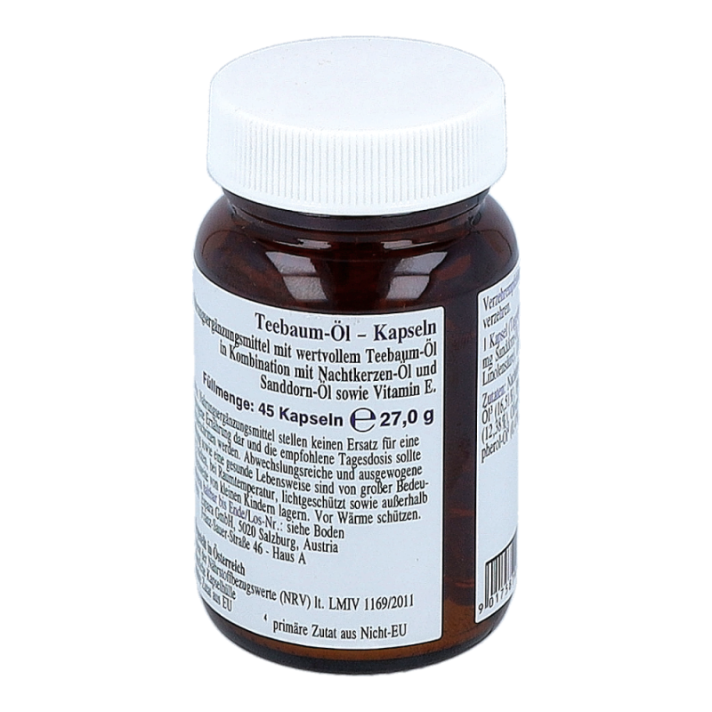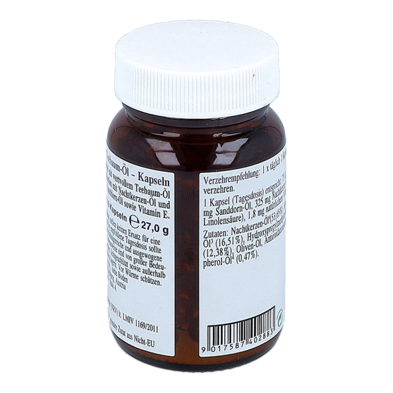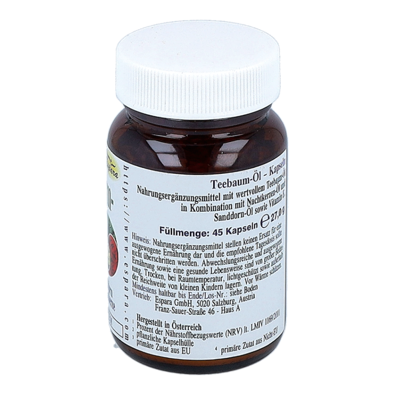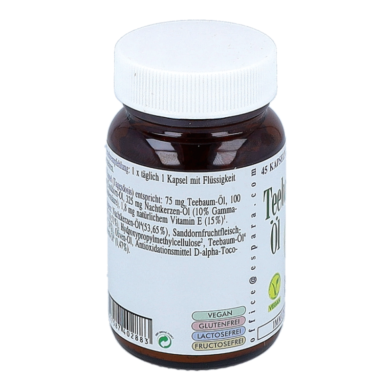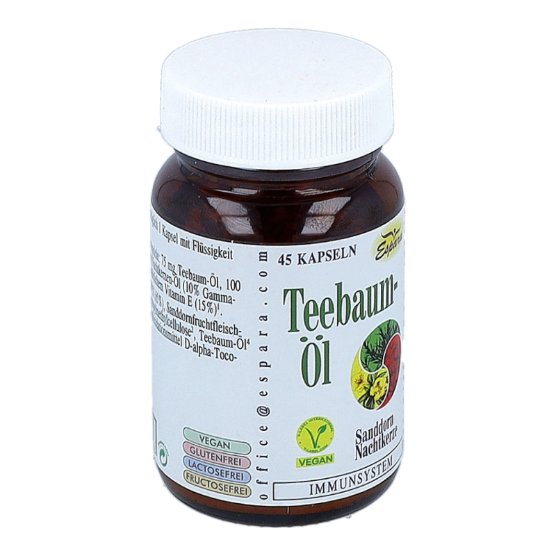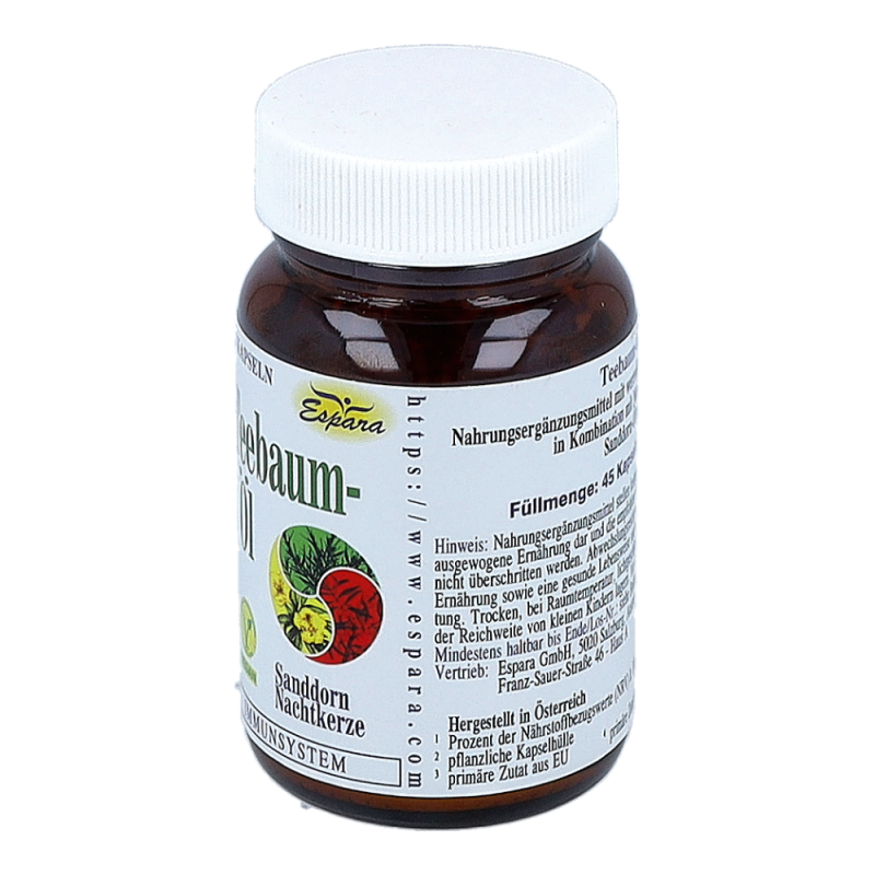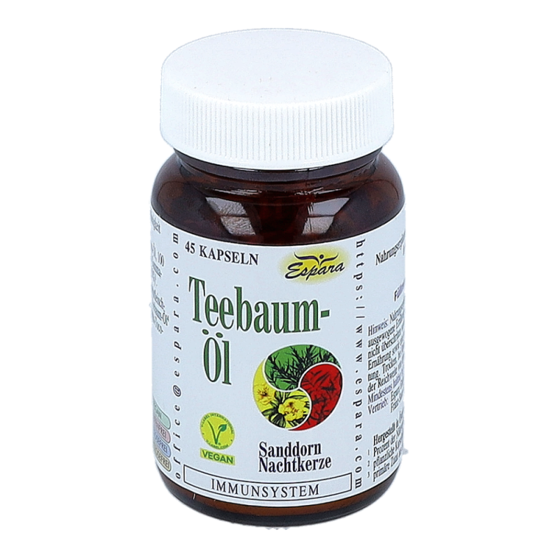Espara Teebaum Öl Kapseln sind ein Nahrungsergänzungsmittel mit wertvollem Teebaumöl in Kombination mit Nachtkerzen- und Sanddornöl. Teebaumöl unterstützt das Immunsystem.