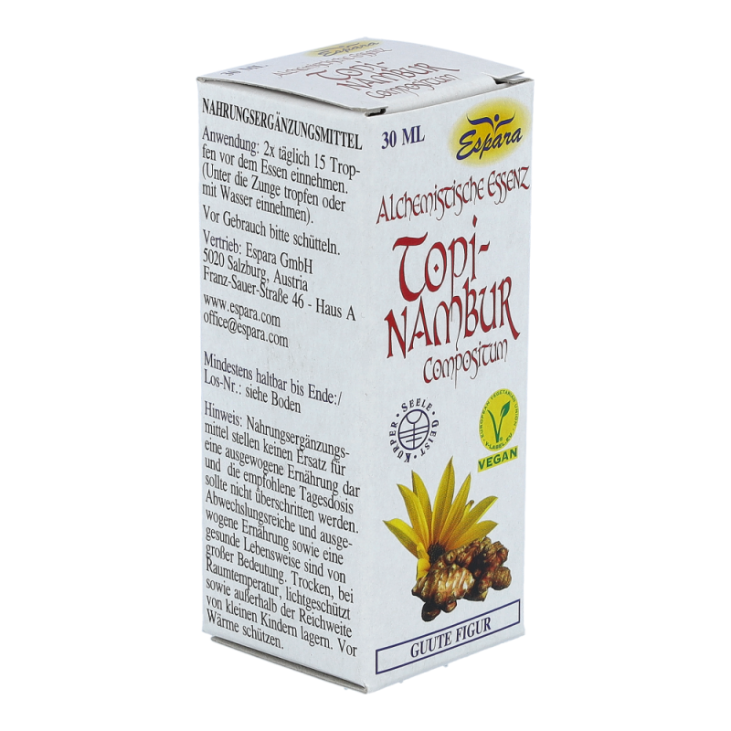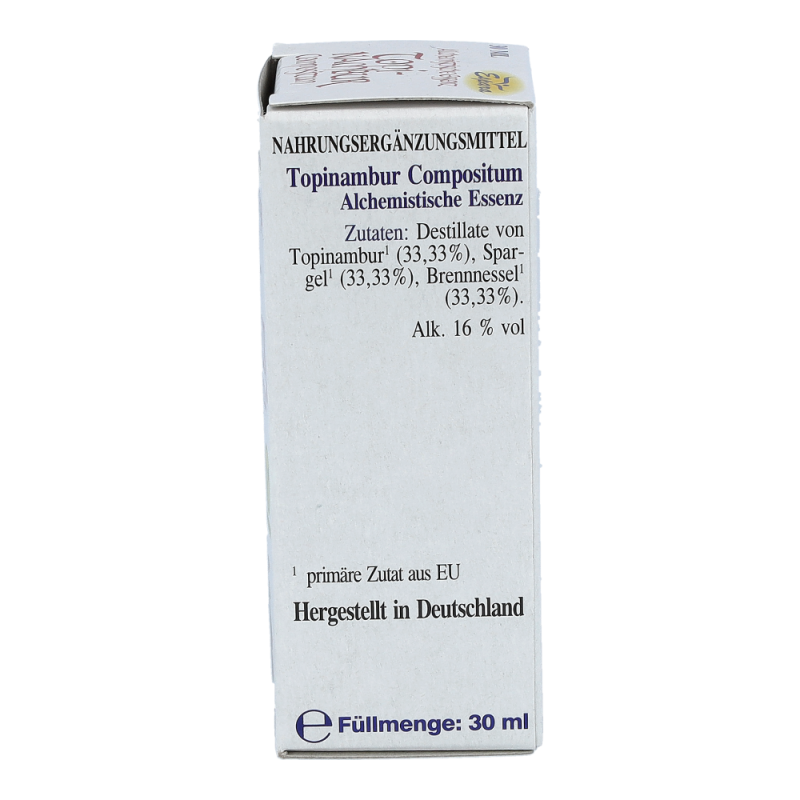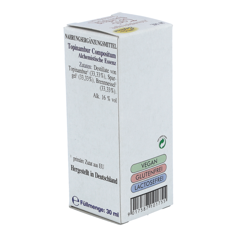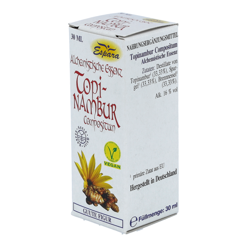 Espara Alchemistische Essenz Topinambur Compositum ist ein Nahrungsergänzungsmittel mit Destillaten von Topinambur, Brennnessel und Spargel. Topinambur ist bekannt für seine verdauungsfördernde Wirkung. Hergestellt nach einem speziellen, auf Paracelsus zurückgehenden Verfahren.