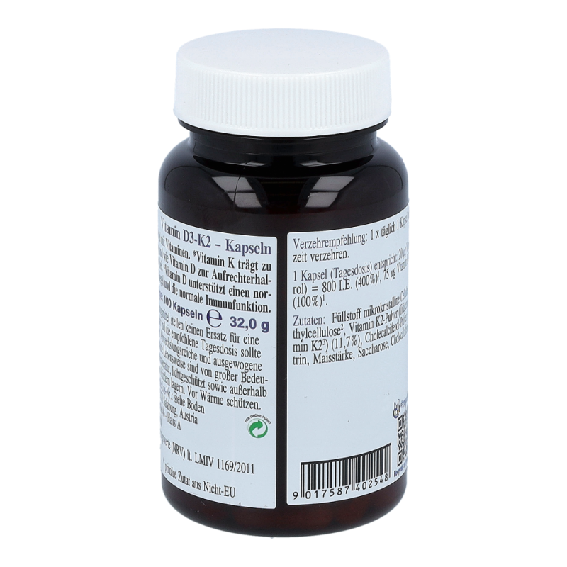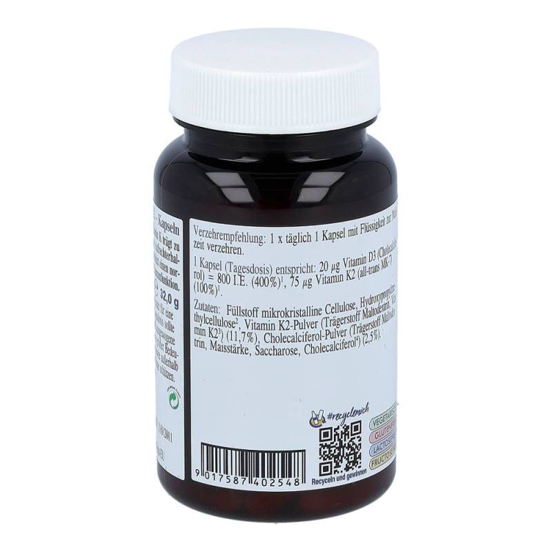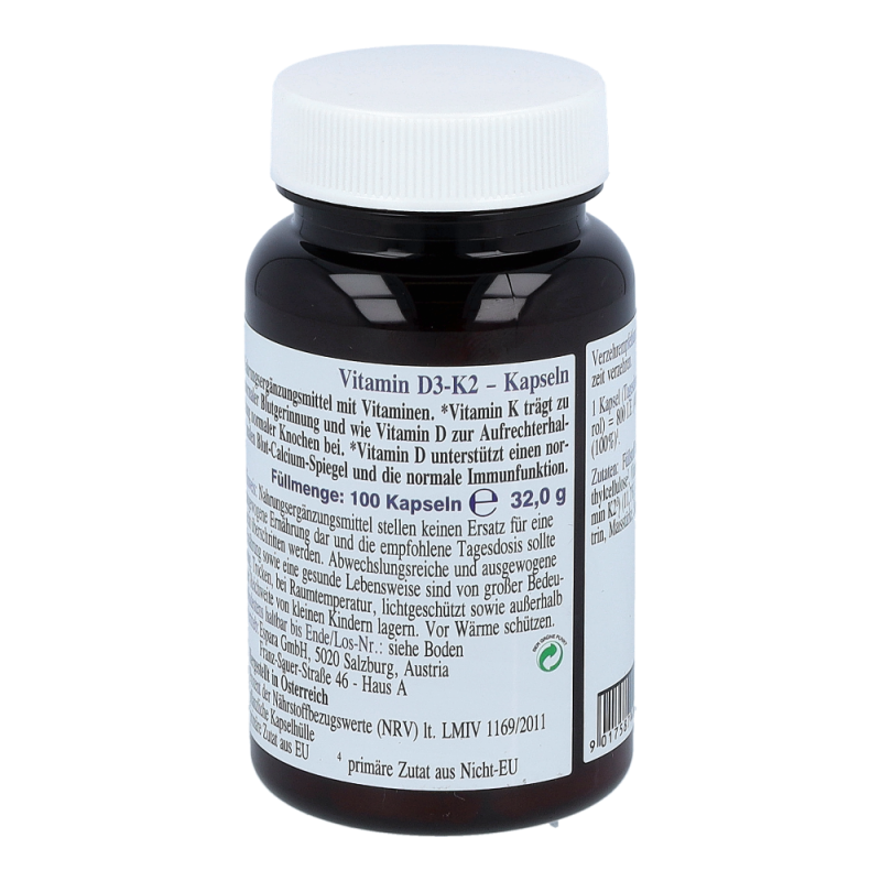 Nahrungsergänzungsmittel mit Vitaminen. Vitamin K trägt zur normalen Blutgerinnung und ebenso wie Vitamin D zur Erhaltung normaler Knochen bei. Vitamin D unterstützt einen normalen Blut-Calcium-Spiegel und die normale Immunfunktion.