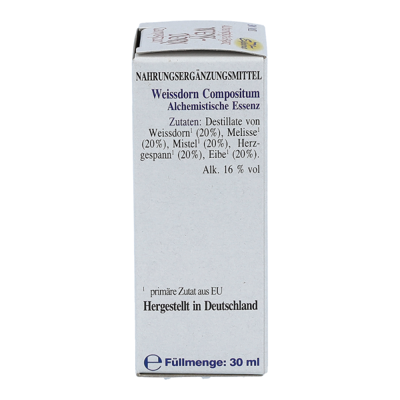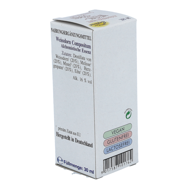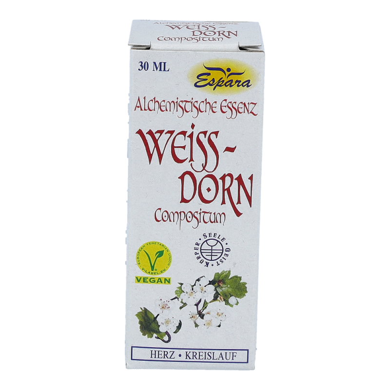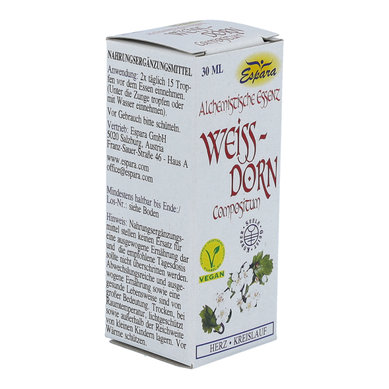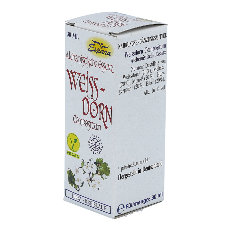 Espara Alchemistische Essenz Weißdorn Compositum ist ein Nahrungsergänzungsmittel mit Destillaten von Weissdorn, Eibe, Melisse und Mistel. Hergestellt nach einem speziellen, auf Paracelsus zurückgehenden Verfahren..