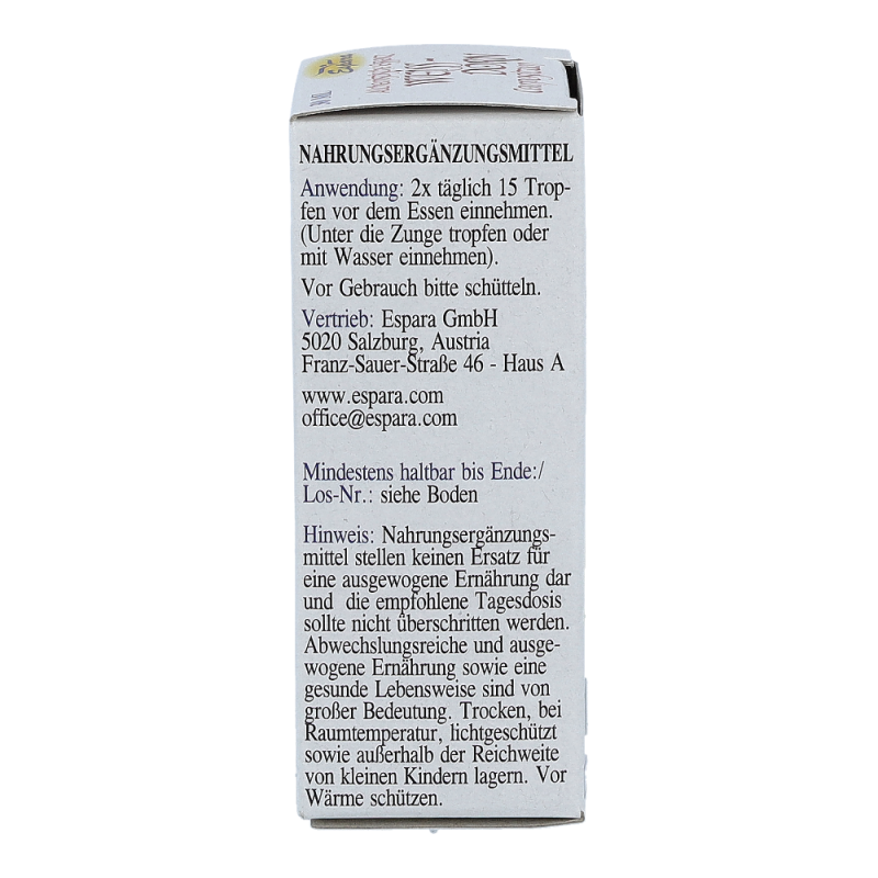 2 x täglich 15 Tropfen vor dem Essen einnehmen. (unter die Zunge tropfen oder mit Wasser einnehmen)