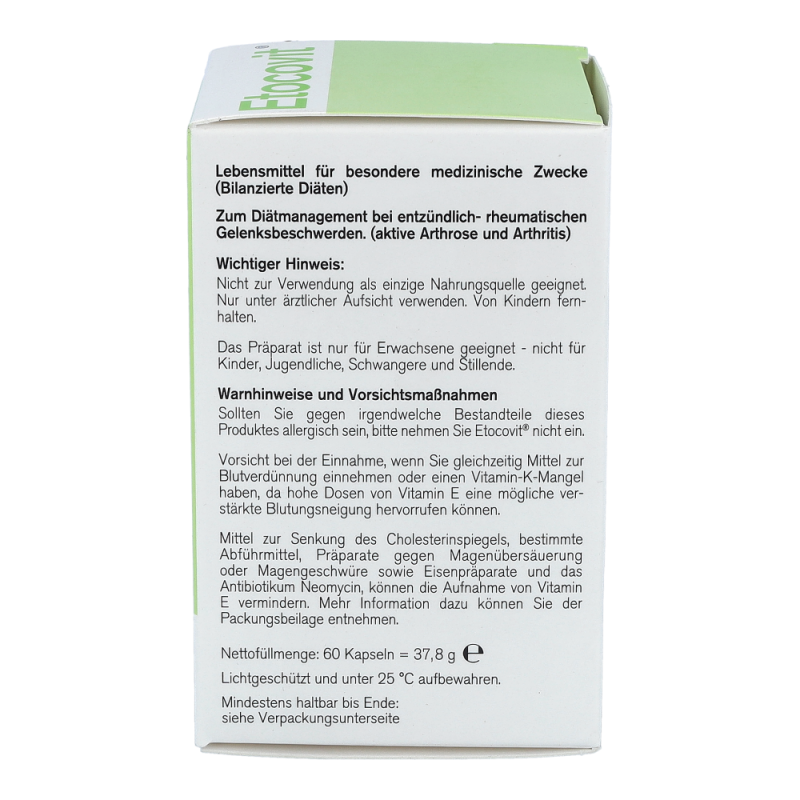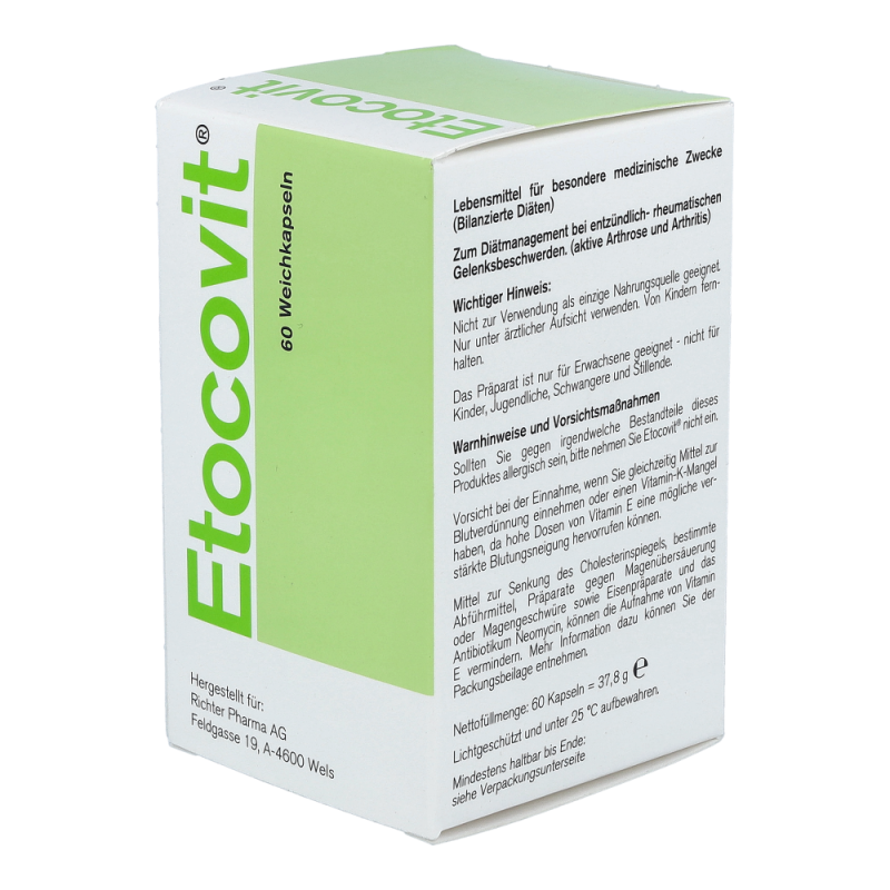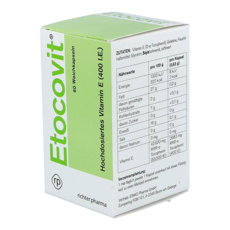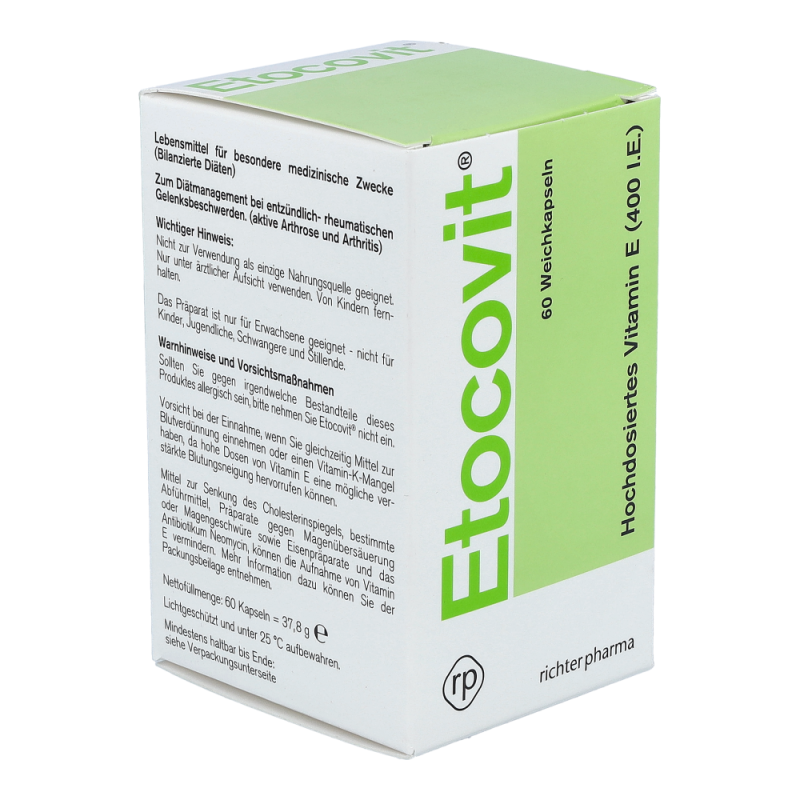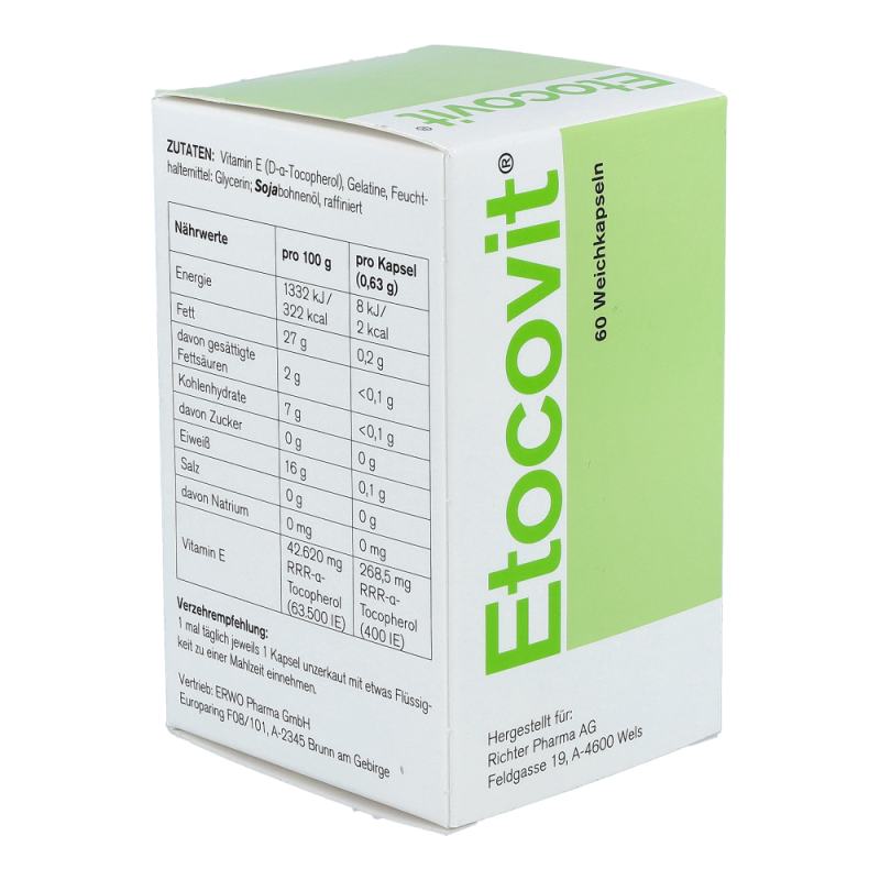 Etocovit Weichkapseln dienen zur Erhaltung der körpereigenen Abwehrkräfte und der Leistungsfähigkeit. Sie sind das Mittel erster Wahl bei gesteigertem Vitamin E-Bedarf und werden auch zur Vermeidung und Behandlung von Vitamin E-Mangelzuständen empfohlen.