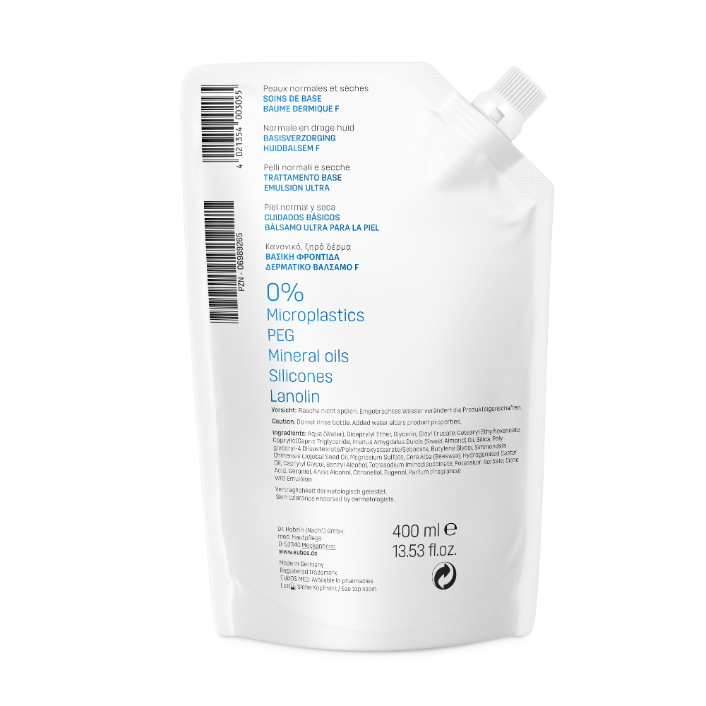 Eubos Hautbalsam F ist eine fett spendende, reichhaltige Körperlotion für trockene und sehr trockene Haut zur täglichen, medizinischen Hautpflege.