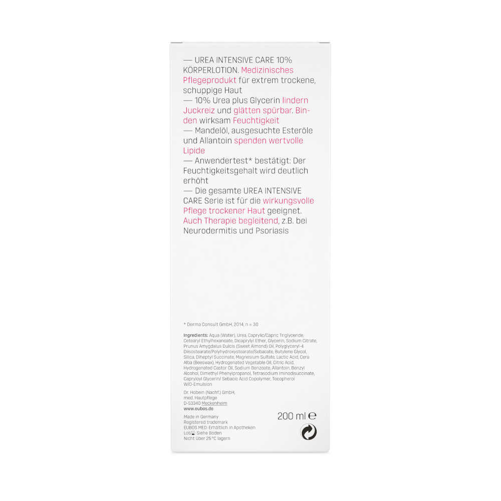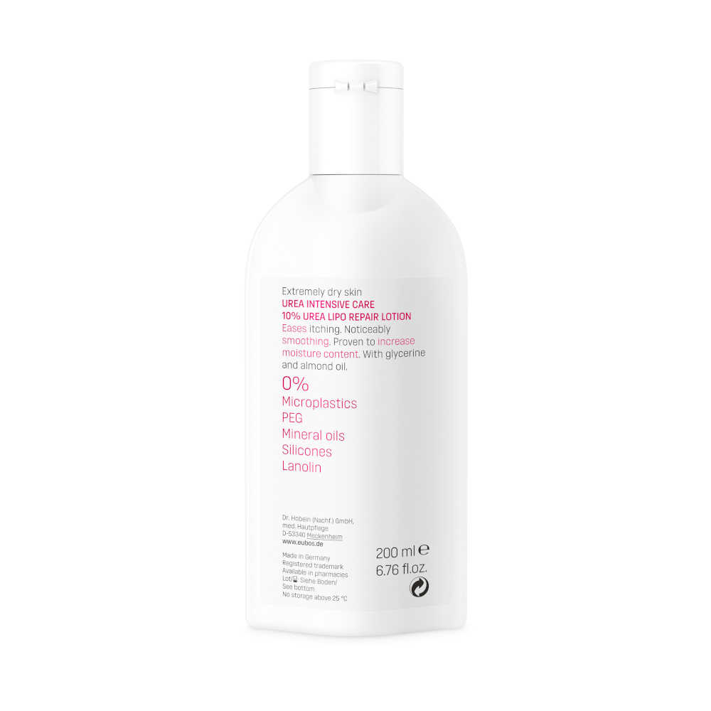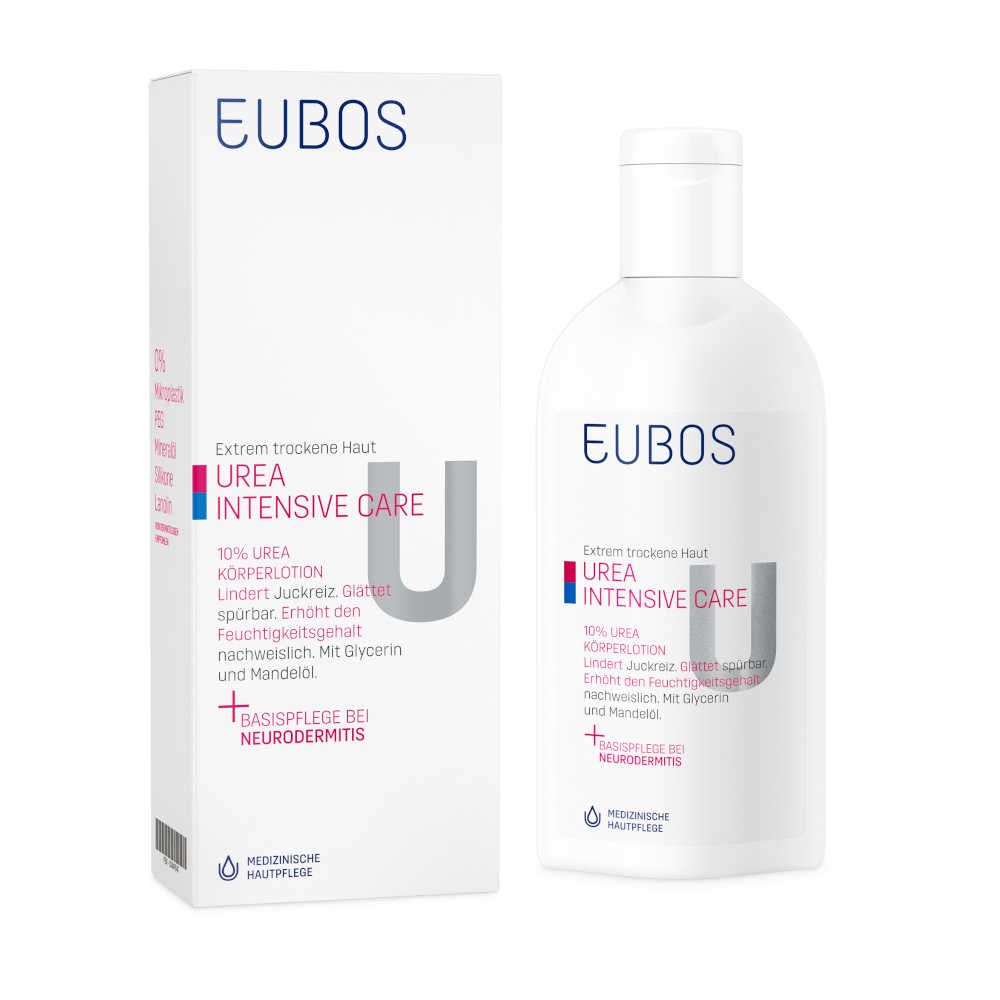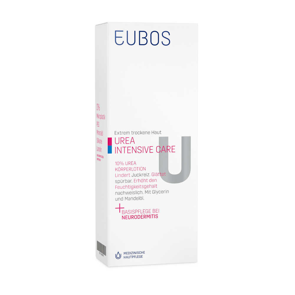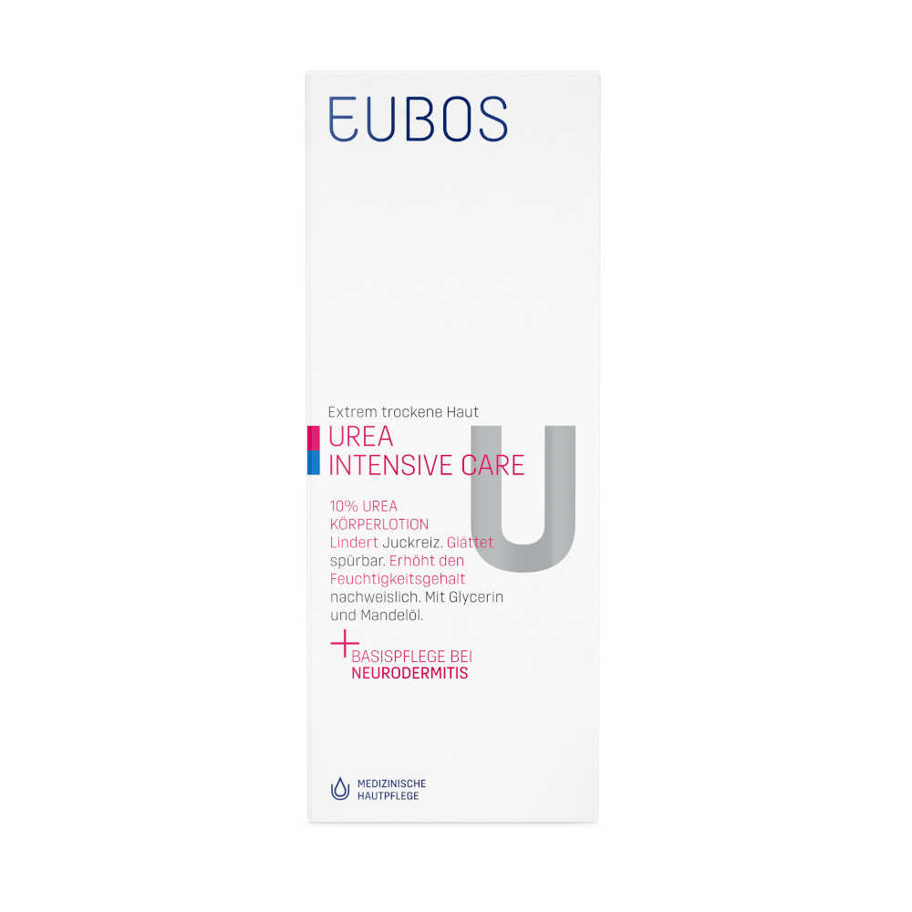 Eubos Urea 10% Körperlotion ist eine reichhaltige Wasser-in-Öl (W/O) Emulsion. Medizinische Spezialpflege für extrem trockene, spannende und rauhe Haut. Glättet spürbar und mindert Juckreiz.