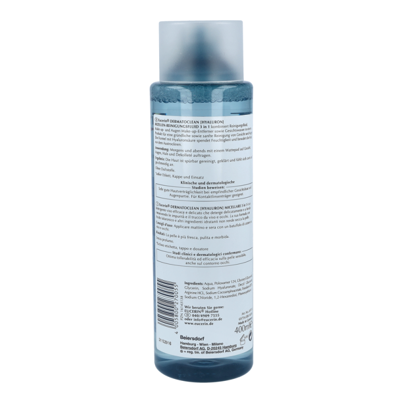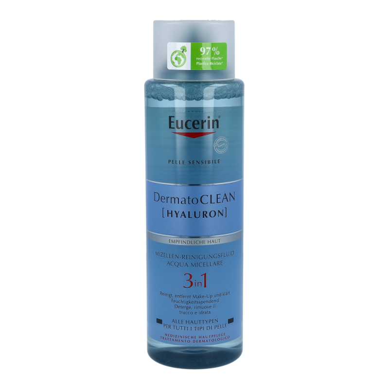 Eucerin DermatoCLEAN 3 in 1 Mizellen-Reinigungsfluid – ein sanftes, aber gründliches Mizellenreinigungsfluid, das Unreinheiten und Make-up entfernt. Angereichert mit feuchtigkeitsspendenden Inhaltsstoffen, reinigt es gründlich und bewahrt die Haut vor dem Austrocknen. Geeignet für den täglichen Gebrauch, sowie für empfindliche Haut.