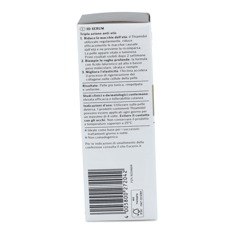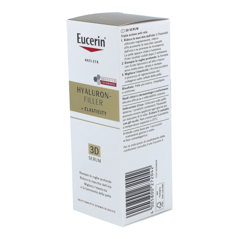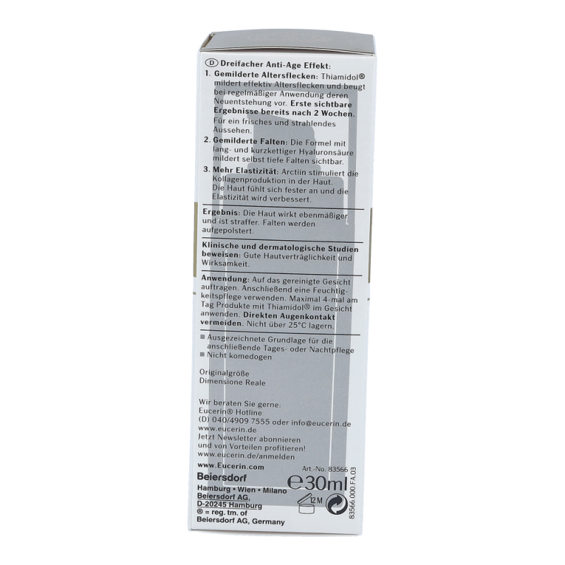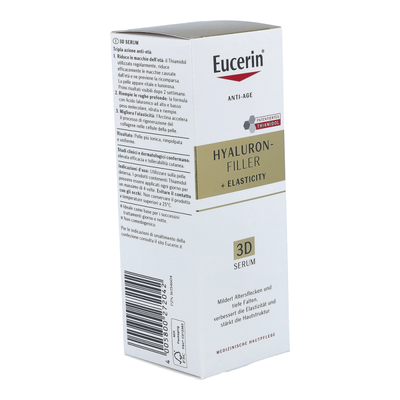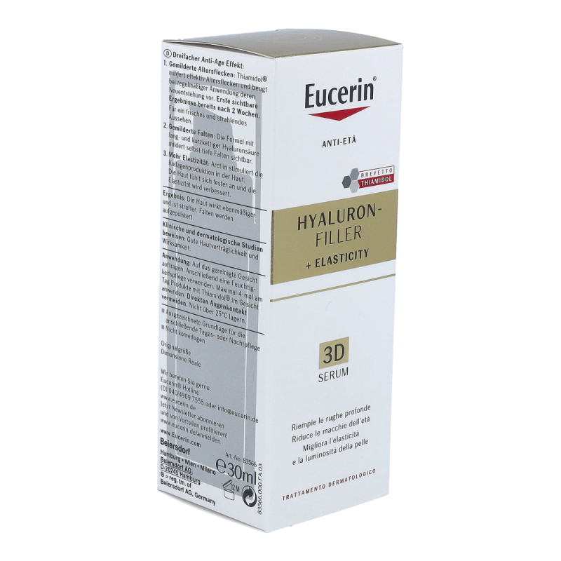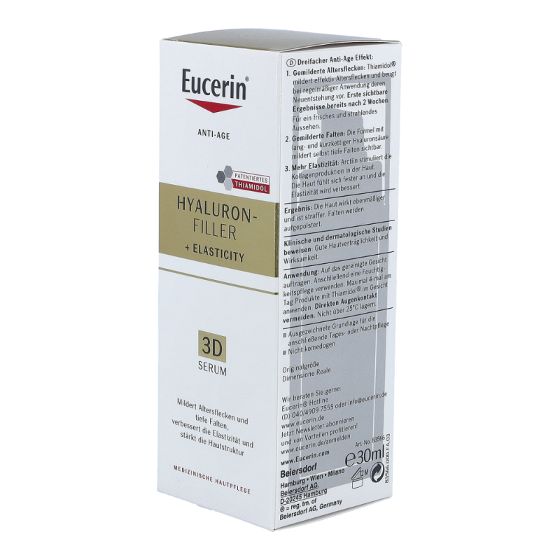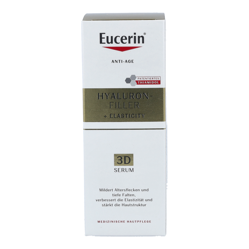 Eucerin Hyaluron-Filler + Elasticity 3D ist ein Anti-Age-Serum für reife Haut, das bei regelmäßiger Anwendung Altersflecken im Gesicht effektiv mildert und deren Neuentstehung vorbeugt, selbst tiefe Falten aufpolstert und die Hautelastizität verbessert. Die Haut wirkt ebenmäßiger und straffer. Die Formel mit Thiamidol® wirkt am Ursprung der Hyperpigmentierung und ist klinisch erwiesen in der Lage, Altersflecken bei regelmäßiger Anwendung effektiv zu mildern und deren Neuentstehung vorzubeugen. Der Wirkstoff Arctiin stimuliert nachweislich die Kollagenproduktion in der Haut. Es trägt zusammen mit der Hyaluronsäure in unserer Formel zur Verbesserung der Hautelastizität bei.