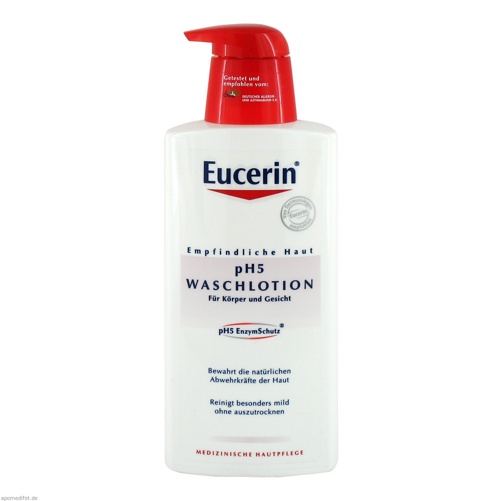 Eucerin pH5 Waschlotion eignet sich zur täglichen Reinigung von Gesicht und Körper – selbst bei Seifenunverträglichkeit. Sie reinigt besonders mild und erhält den Eigenschutz der Haut durch die besonders hautverträgliche Formel. Eucerin ph5 Waschlotion ist Alkaliseifenfrei. Der einzigartige Eucerin pH5 EnzymSchutz aktiviert nachweislich die hauteigenen Enzyme und stärkt so die Barrierefunktion der Haut. Auf diese Weise werden Pollen am Eindringen in die Haut gehindert Der pH5 Citratpuffer stabilisiert den hauteigenen pH Wert.