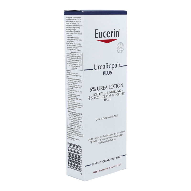 Eucerin 5% Urea Repair PLUS Lotion – Intensive Pflege für trockene bis sehr trockene Haut. Die leichte, hochwirksame Körperlotion spendet und bindet intensiv Feuchtigkeit. Sie beruhigt die Haut sofort und schützt 48 h vor trockener Haut.