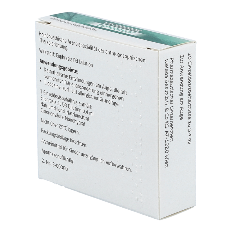 Weleda Euphrasia D 3 Augentropfen Einzeldosen mit dem enthaltenen Heilpflanzenauszug aus Augentrost wirkt lindernd bei entzündeten und tränenden Augen. Augentrost beruhigt unangenehmes Brennen und Jucken und lässt leichte, nicht-infektiöse Bindehautentzündungen durch Reize wie Pollen, Zugluft oder Rauch schnell abklingen.