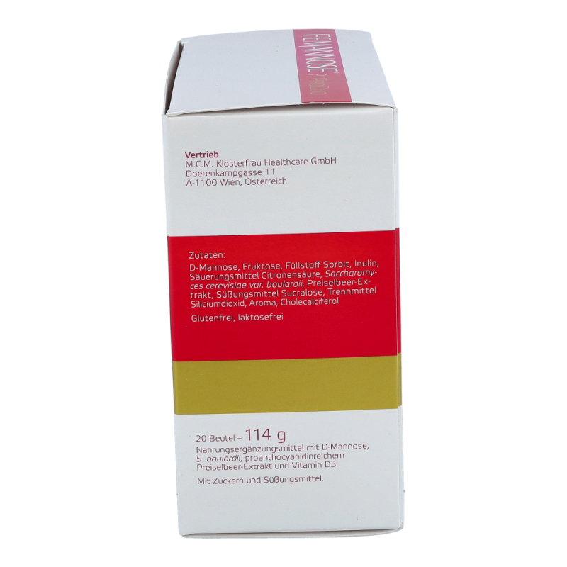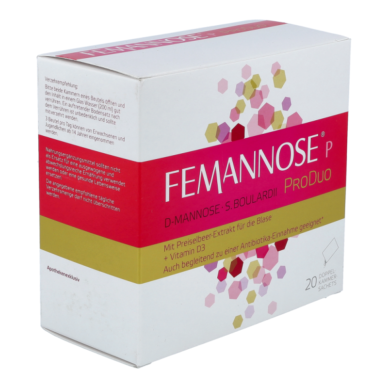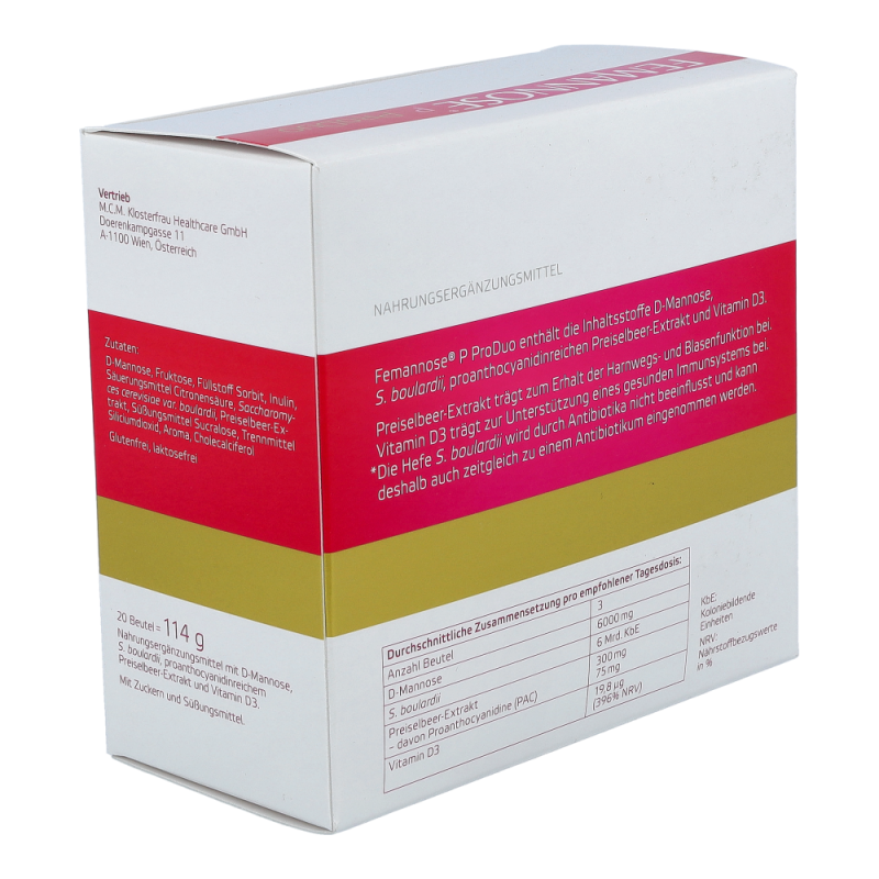 Ein Doppelkammersachet FEMANNOSE®P ProDuo enthält 2 Gramm D-Mannose, ein natürlicher Einfachzucker, der aus nicht-gentechnisch-verändertem Mais gewonnen wird. 2 Milliarden koloniebildende Einheiten des probiotischen Hefepilz S. boulardii sind ebenfalls in FEMANNOSE®P ProDuo enthalten. Ergänzt wird diese Zusammensetzung durch 100 mg proanthocyanidinreichem Preiselbeer-Extrakt (25 mg PAC pro Doppelkammersachet) für die Gesunderhaltung der Harnwege und 6,6 µg (132% NRV) Vitamin D3 zur Unterstützung des Immunsystems. Die zeitgleiche Einnahme mit Antibiotika ist möglich, da Saccharomyces boulardii nicht von Antibiotika beeinflusst wird.
