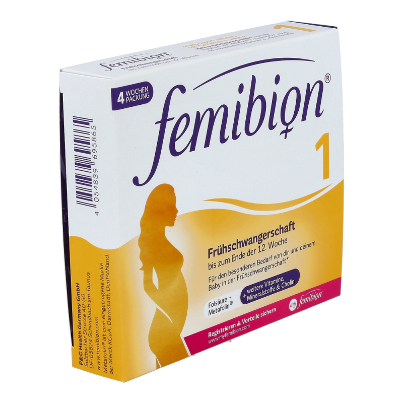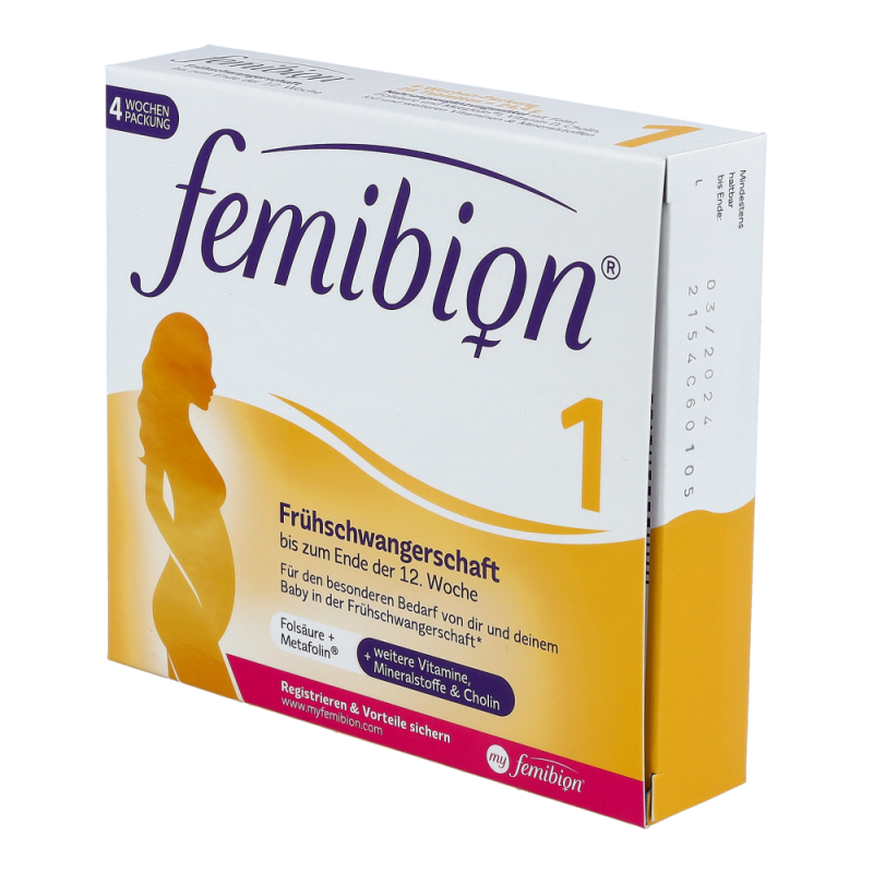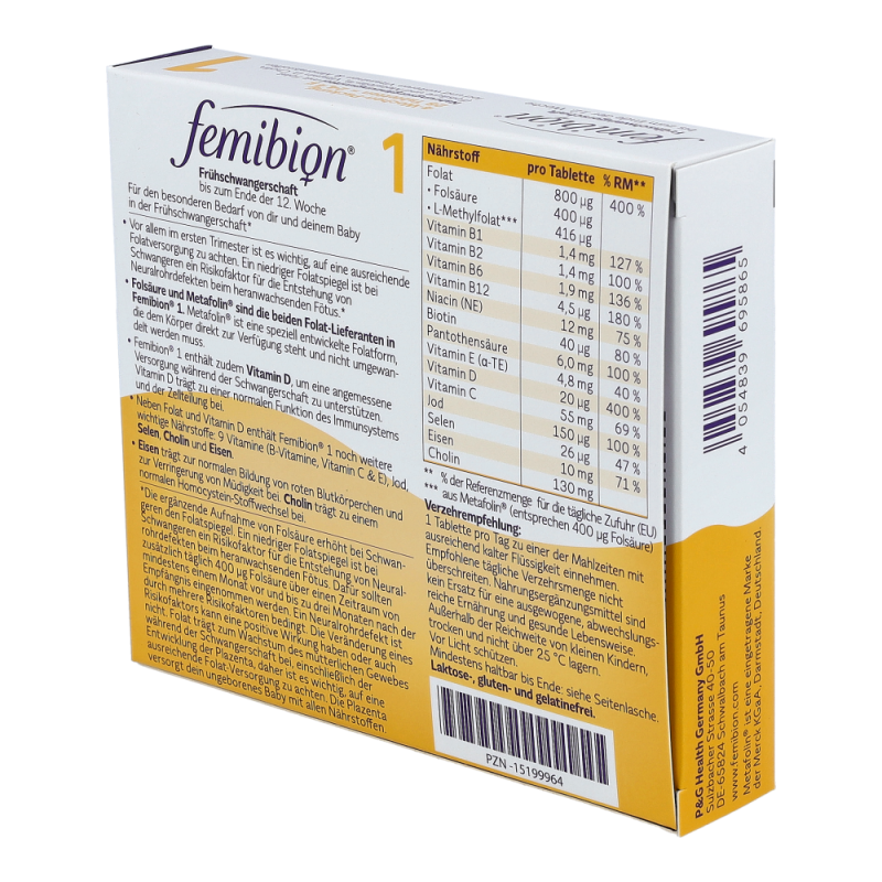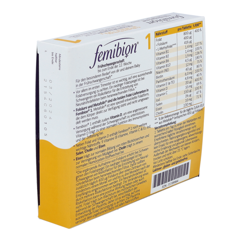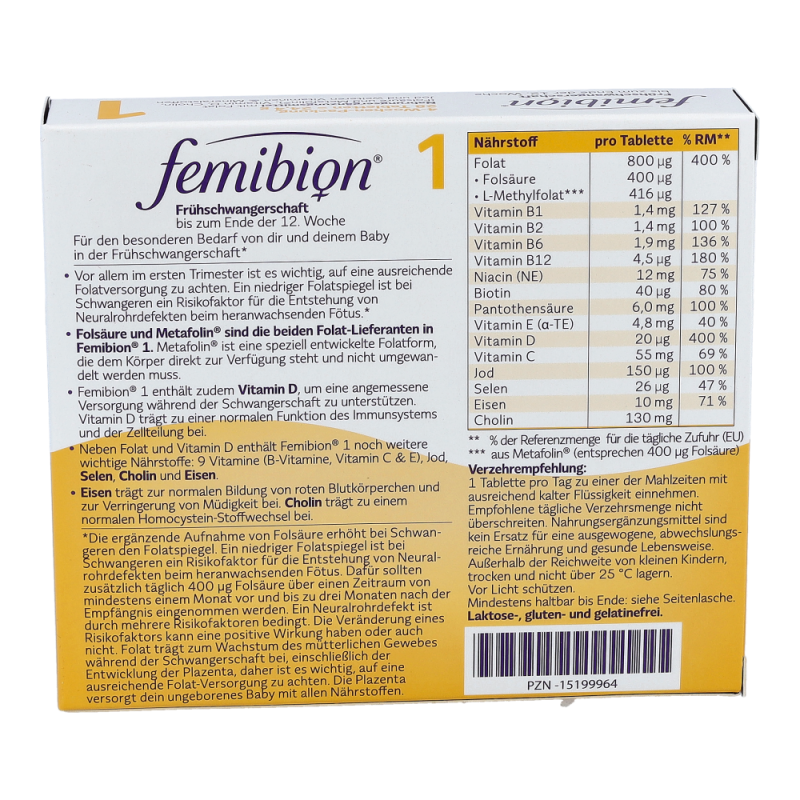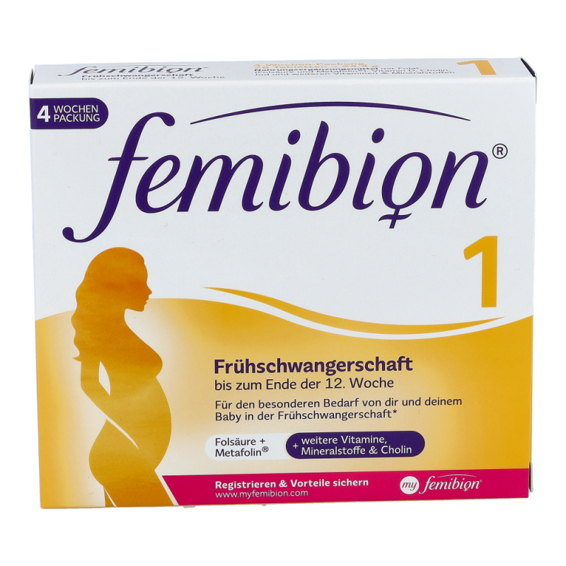 Abgestimmt auf den besonderen Nährstoffbedarf ab Beginn der Schwangerschaft bis zum Ende des ersten Schwangerschaftsdrittels.Sorge für einen guten Start des Babys ins Leben, indem man sich bewusst ernährst. Femibion® 1 ist speziell auf die Bedürfnisse ab Beginn der Schwangerschaft bis zum Ende des ersten Schwangerschaftsdrittels abgestimmt. Mit 800 µg Folat für den effektiven Aufbau des Folat-Spiegels in den ersten Schwangerschaftswochen.Femibion® 1 enthält neben 800 µg Folat-Booster (Folsäure und Metafolin®) Vitamin D und weitere wichtige Nährstoffe: 9 Vitamine (B-Vitamine, Vitamin C & E), Jod, Selen, Cholin und Eisen.