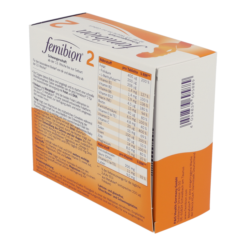 Für den besonderen Bedarf von Mutter und dem Baby in der Schwangerschaft. Die Organe des Babys sind angelegt und es startet eine schnelle Wachstumsphase. Femibion® 2 wird daher für eine ausreichende Versorgung mit Folat und DHA eingenommen. Folsäure und Metafolin® sind die beiden Folat-Lieferanten in Femibion®. Metafolin® ist eine speziell entwickelte Folatform, die dem Körper direkt zur Verfügung steht und nicht umgewandelt werden muss.