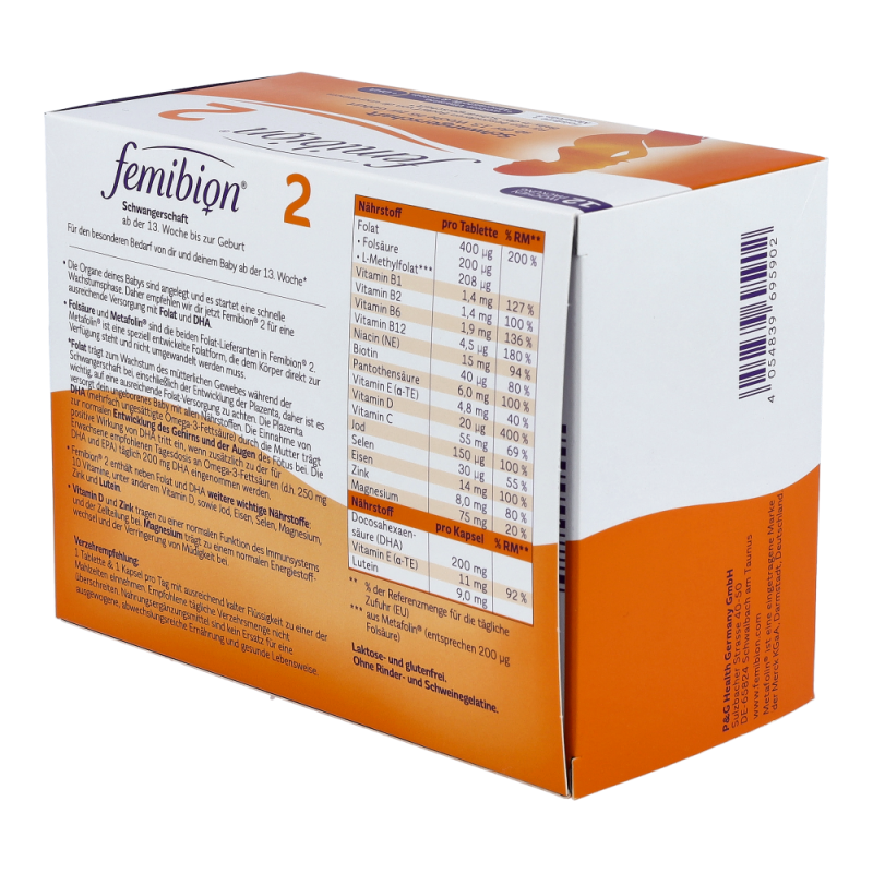 Femibion Schwangerschaft 2 Tabletten + Kapseln liefern wertvolle Nährstoffe und Omega-3 Fettsäuren, um dem erhöhten Nährstoffbedarf während der Schwangerschaft gerecht zu werden. Femibion versorgt Ihren Körper und den Ihres Ungeborenen mit lebensnotwendigen Vitaminen und Mineralstoffen. Die zusätzlichen Kapseln mit Omega-3-Fettsäuren unterstützen eine optimale kognitive Entwicklung.