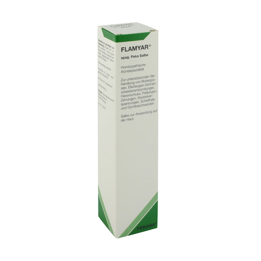 Flamyar Spagyra Salbe Pekana dient zur unterstützenden Behandlung von Blutergüssen, Ellenbogen-Sehnenscheidenentzündungen, Hexenschuss, Prellungen, Zerrungen, Muskelverspannungen, Schiefhals und Gichtbeschwerden.