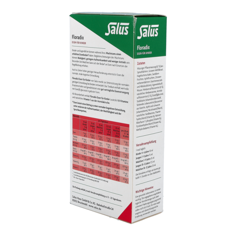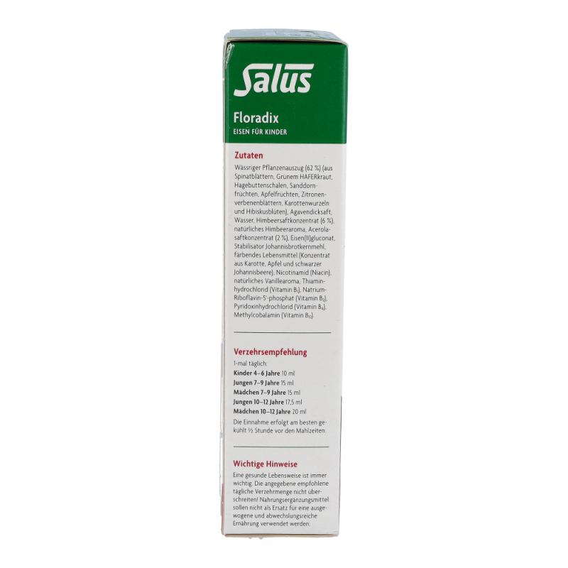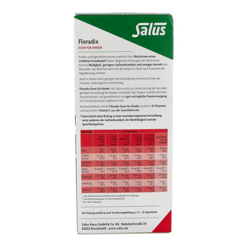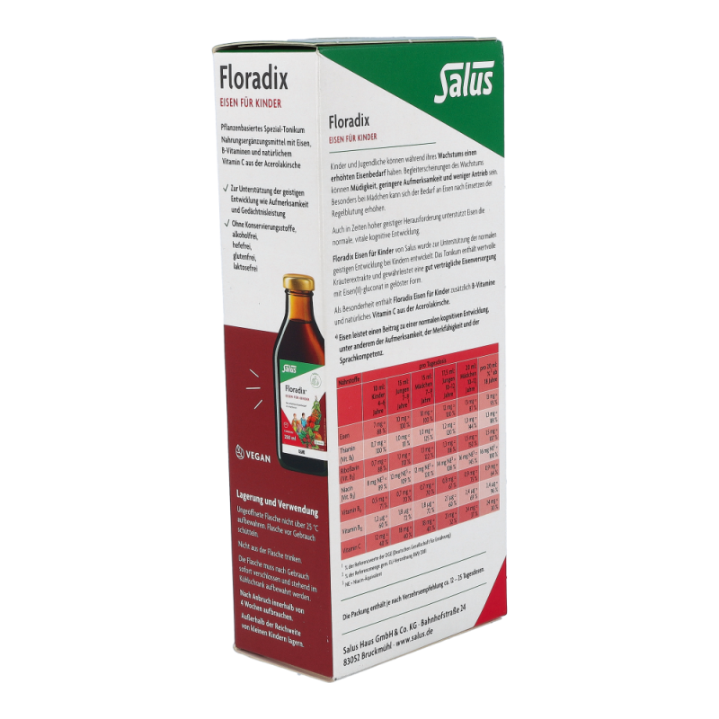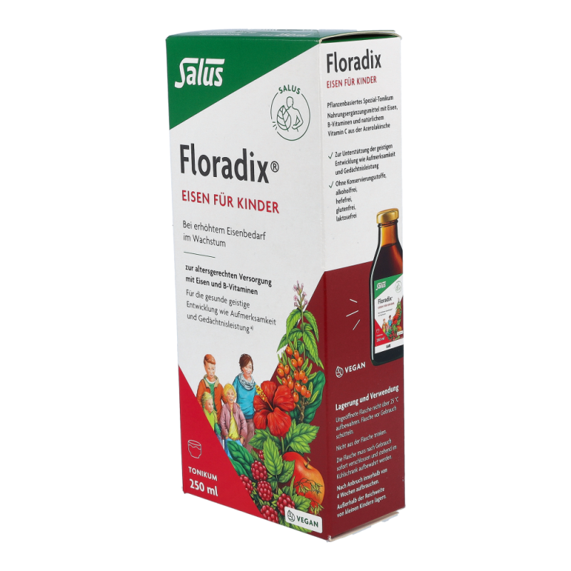 Floradix-EisenTonikum für Kinder mit leckerem Himbeersaft und natürlichen Kräuterextrakten. Es dient zur optimalen Eisen-Aufnahme (Eisen(II)gluconat) mit natürlichem Vitamin aus der Acerolakrische.
