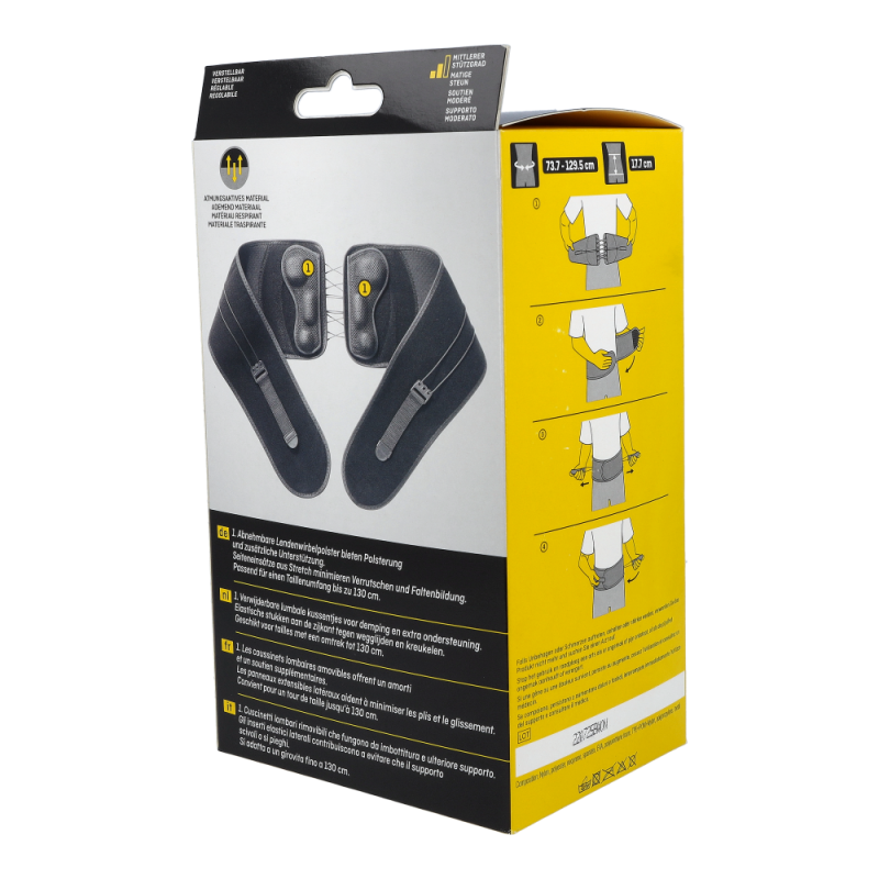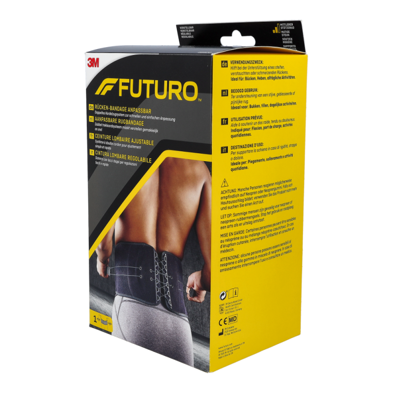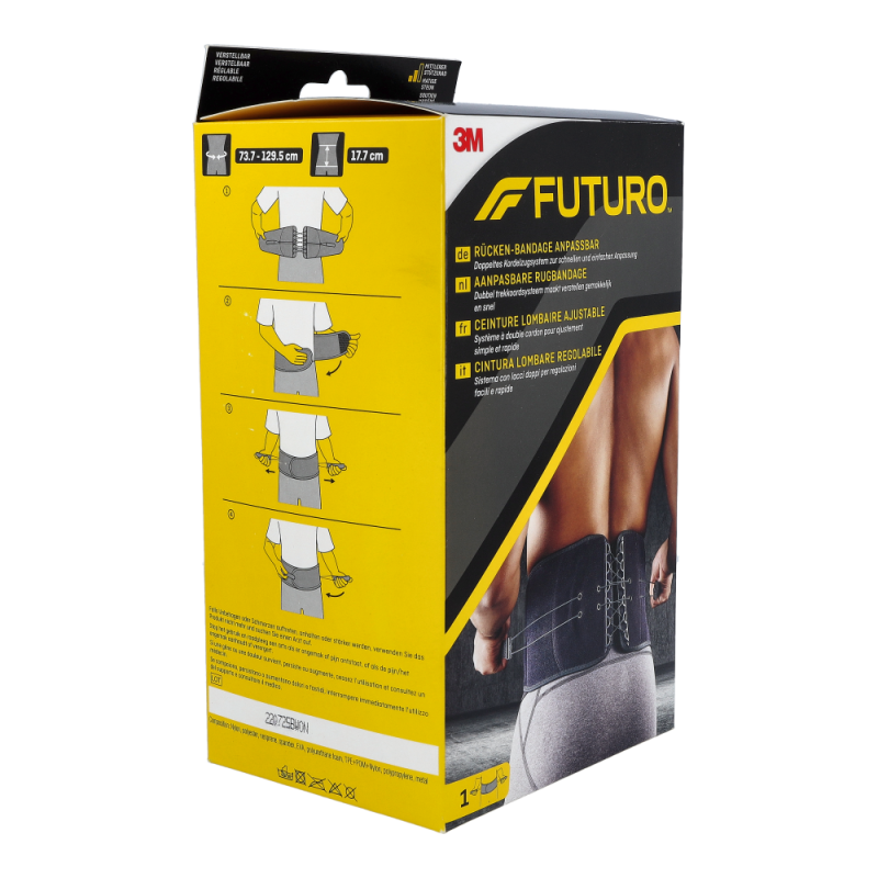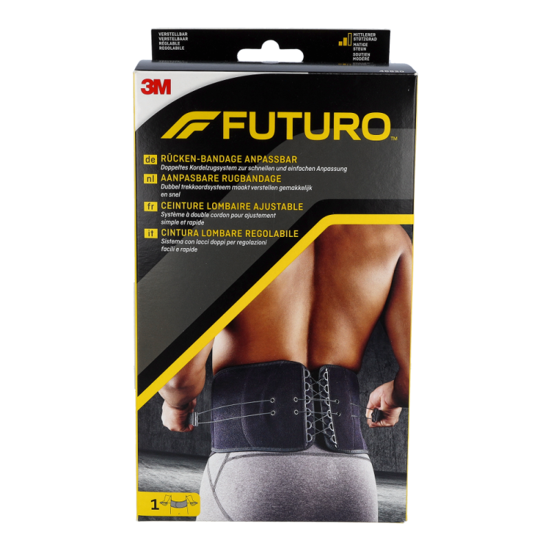 Futuro Rückenbandage hilft bei akuten und chronischen Rückenschmerzen, postoperativen Behandlungen und Lumbago. Mit ihren anpassbaren Gurten sorgt sie für einen optimalen Sitz, eine individuelle Stabilisierung und Kompressionsanpassung und trägt sich dabei äußerst angenehm. Ihr Material ist hautfreundlich und atmungsaktiv.
