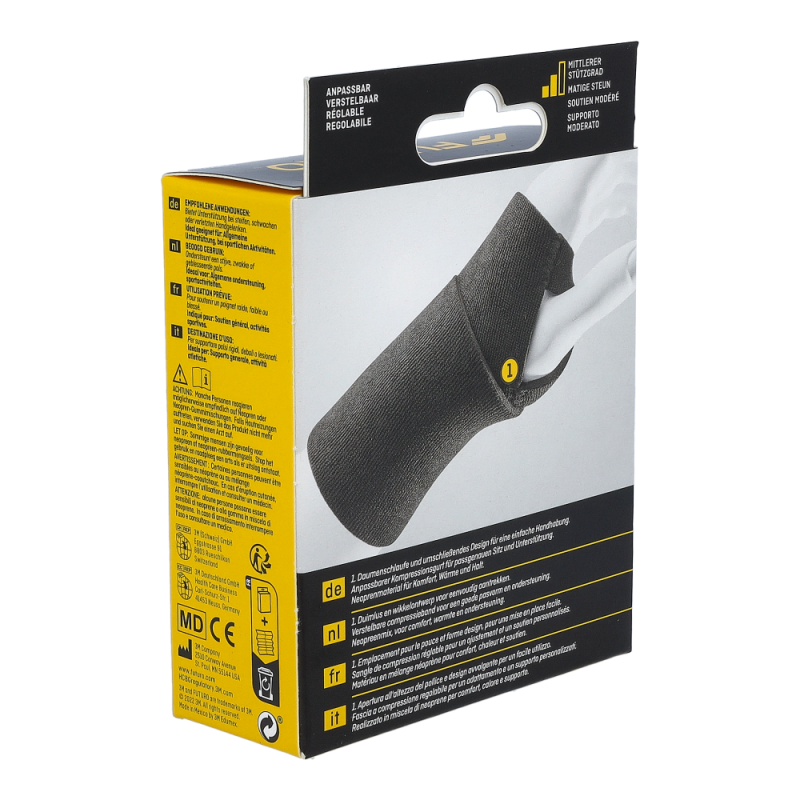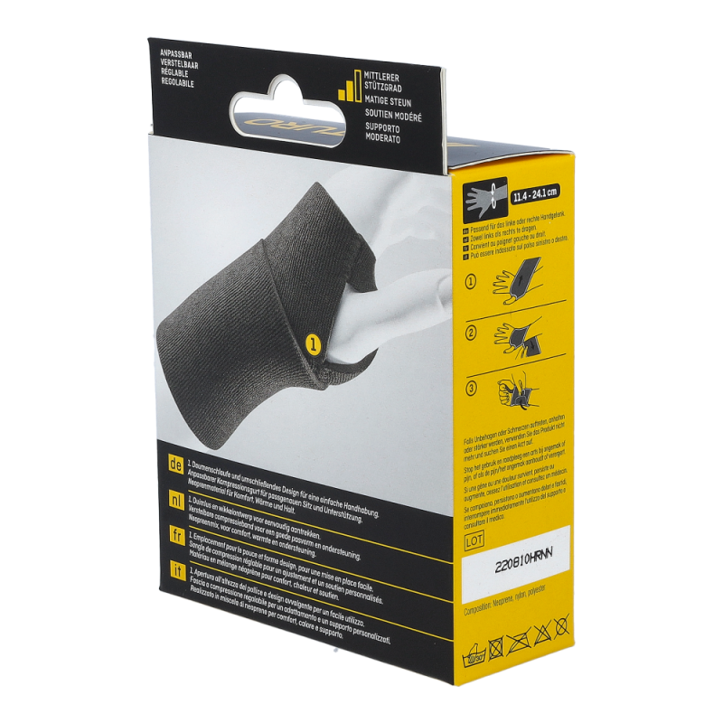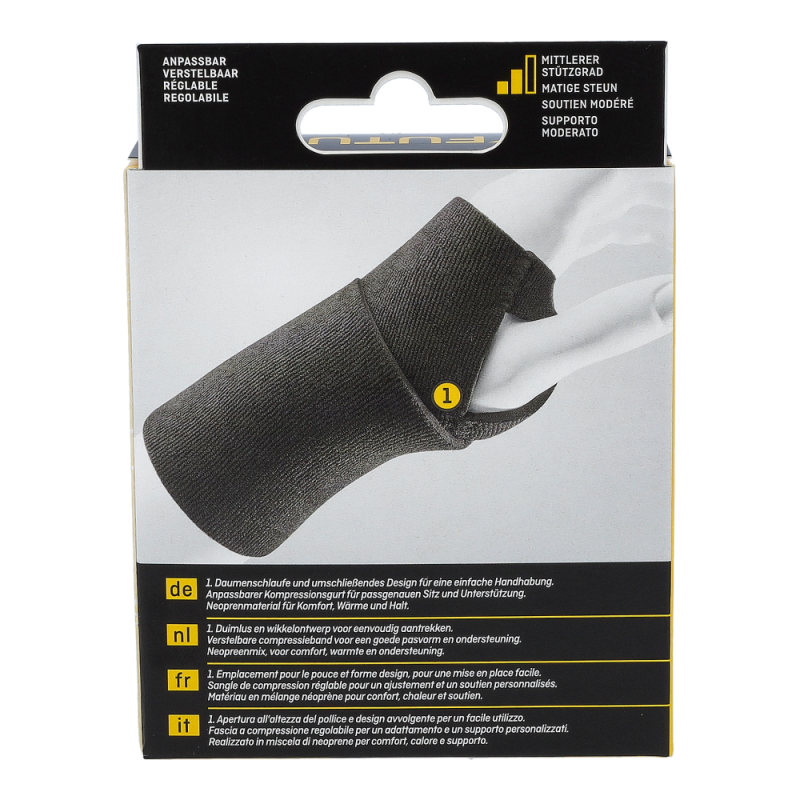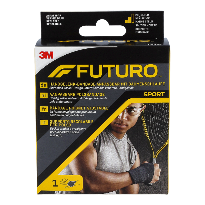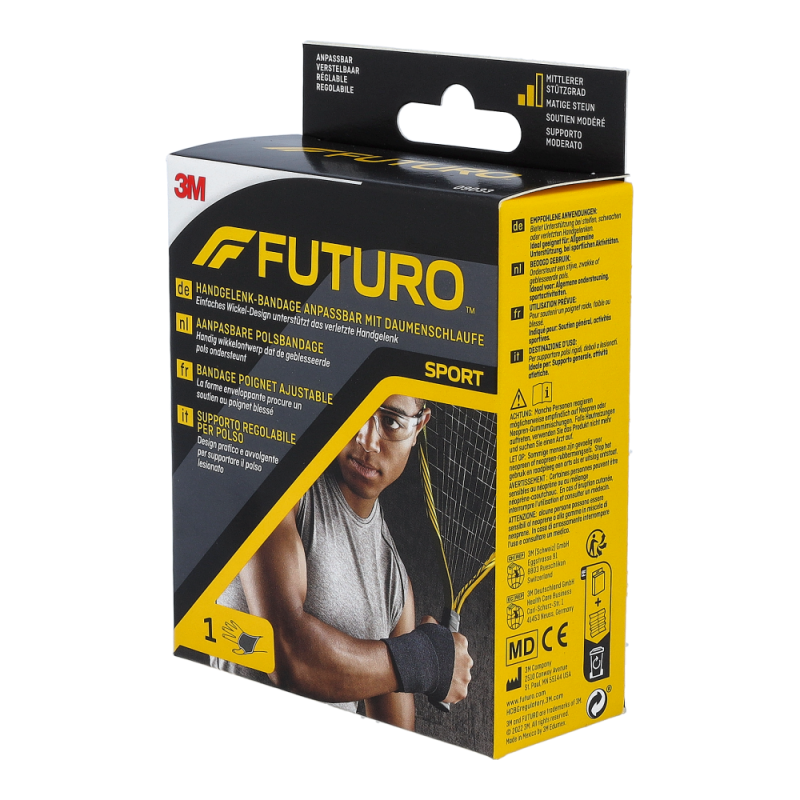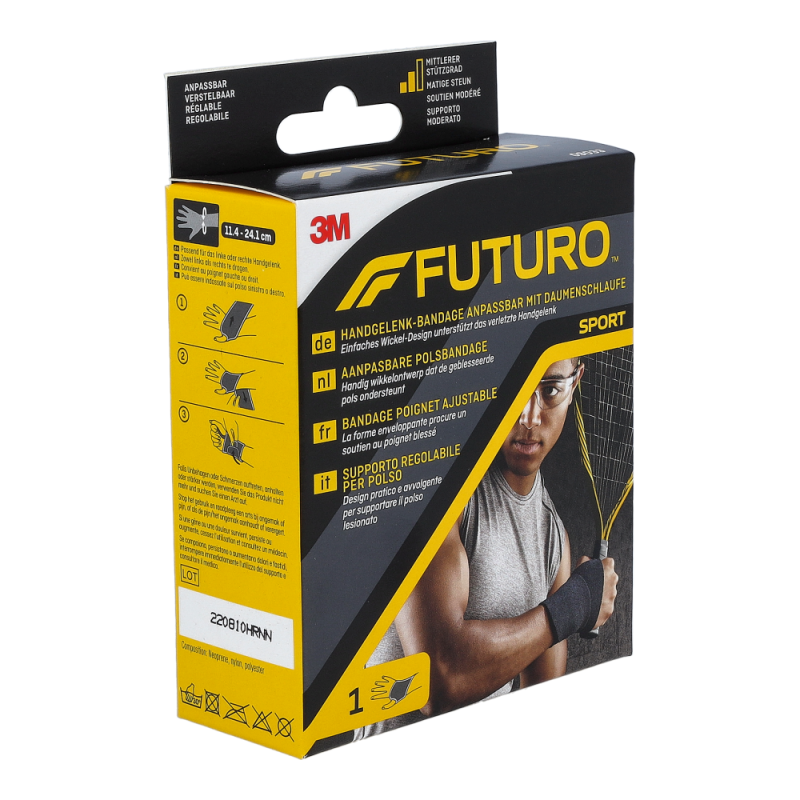 Futuro Sport Handgelenksbandage stützt und stabilisiert steife, schwache oder verletzte Handgelenke. Sie bietet darüber hinaus Schutz vor weiteren Verletzungen. Die Bandage zeichnet sich dank ihres einstellbaren Kompressionsriemens durch einen hohen Tragekomfort und eine individuelle Passform aus.