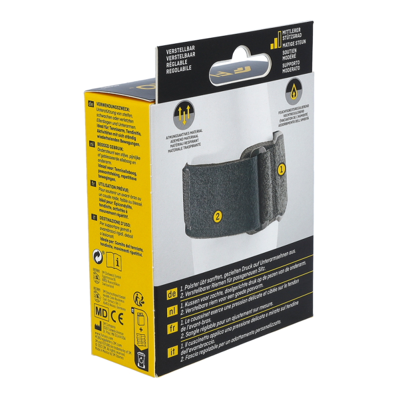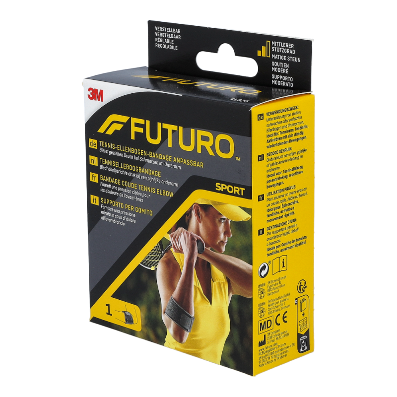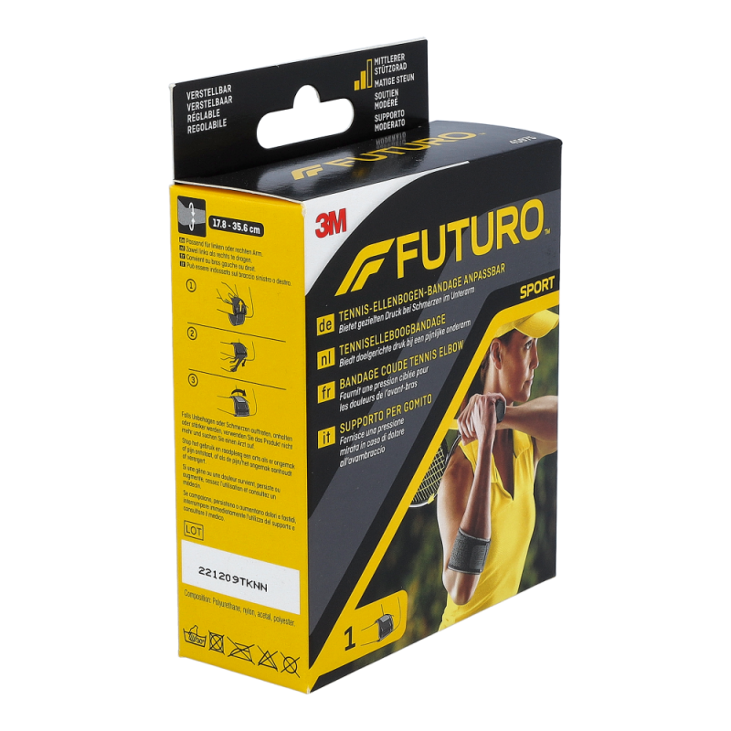 Futuro Tennis Ellenbogenbandage hilft bei Schmerzen bei gereiztem Gelenk, Überlastungssyndrom sowie Tennis- oder Golferarm. Sie ist einfach anzuziehen, passt sich perfekt an und sorgt dank ihres hautfreundlichen, atmungsaktiven Materials für einen angenehmen Tragekomfort. Zudem helfen spezielle Massagepelotten, Ihre Schmerzen zu lindern und üben darüberhinaus einen beschleunigten Heilungsprozess aus.