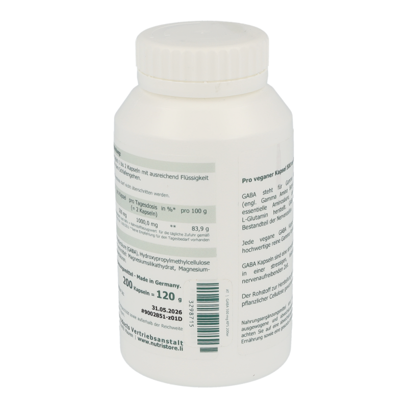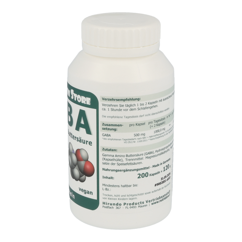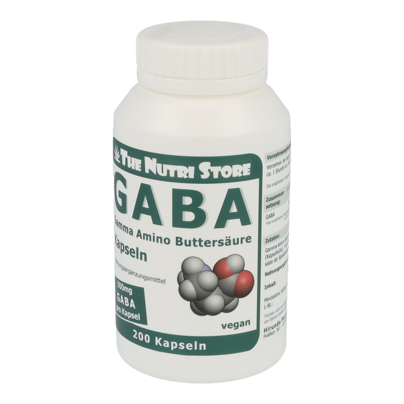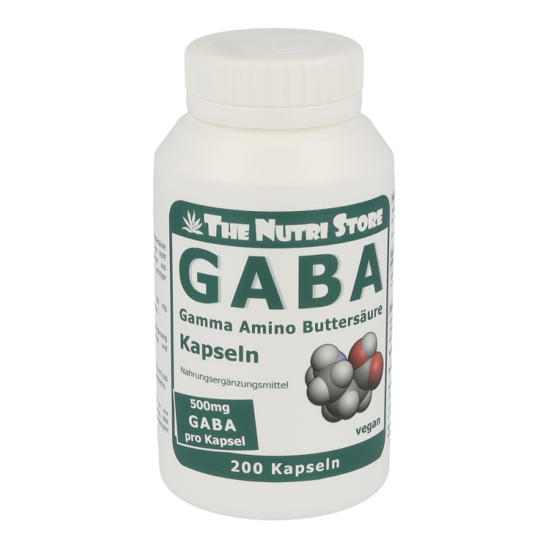 The Nutri Store GABA Gamma Amino Buttersäure Kapseln – GABA steht für Gamma Amino Buttersäure (engl. Gamma Amino Butyric Acid), eine nicht essentielle Aminosäure, die der Körper aus L-Glutamin herstellt. Jede vegetarische GABA Kapsel enthält 500 mg hochwertige reine Gamma Amino Buttersäure.