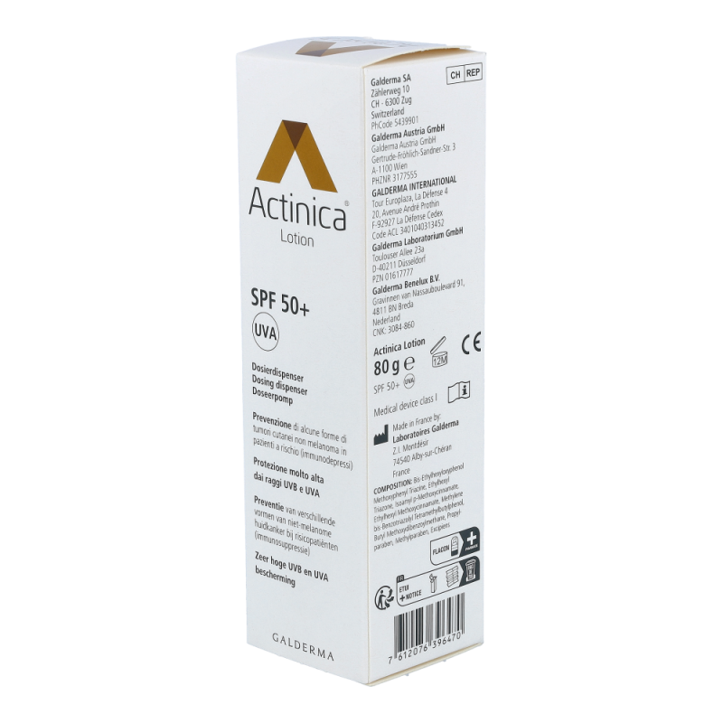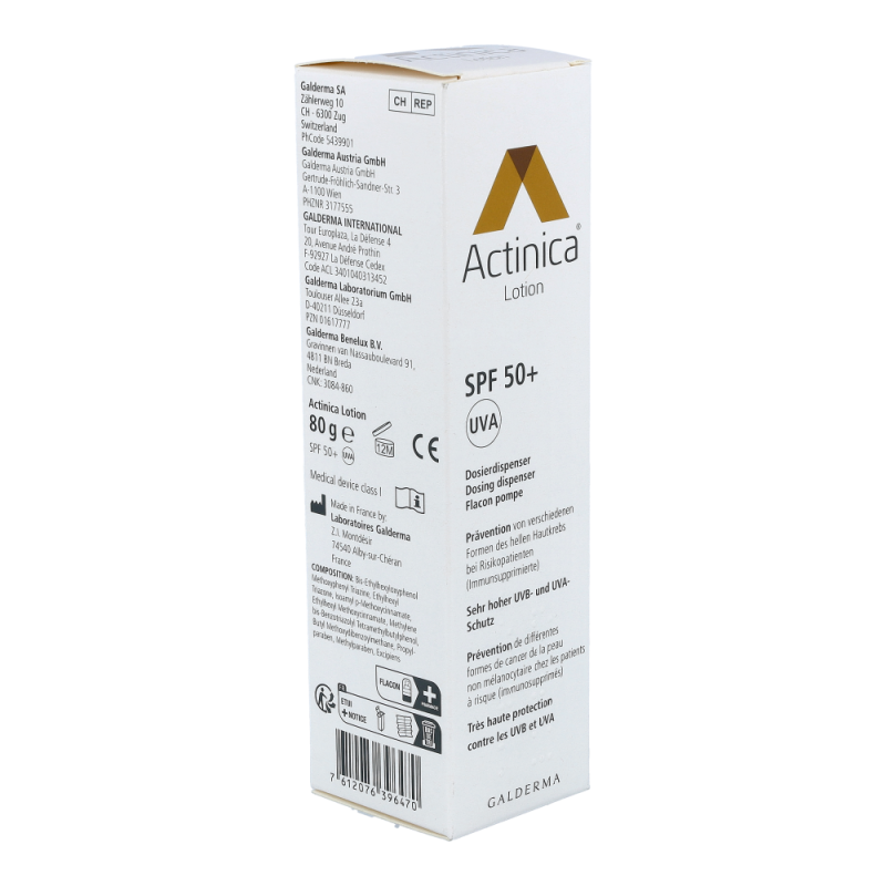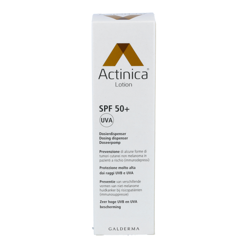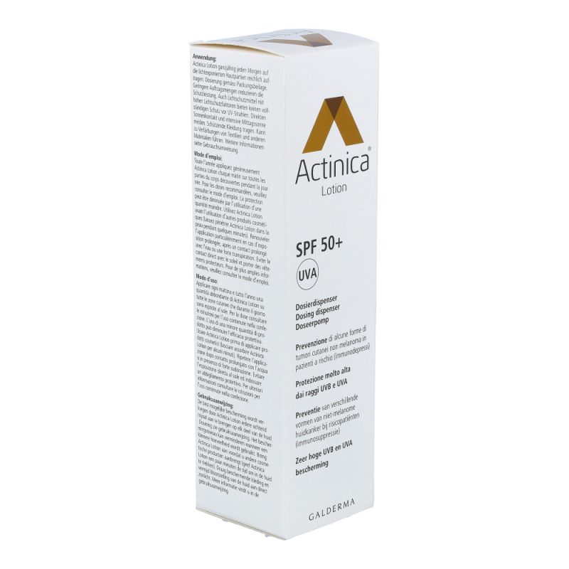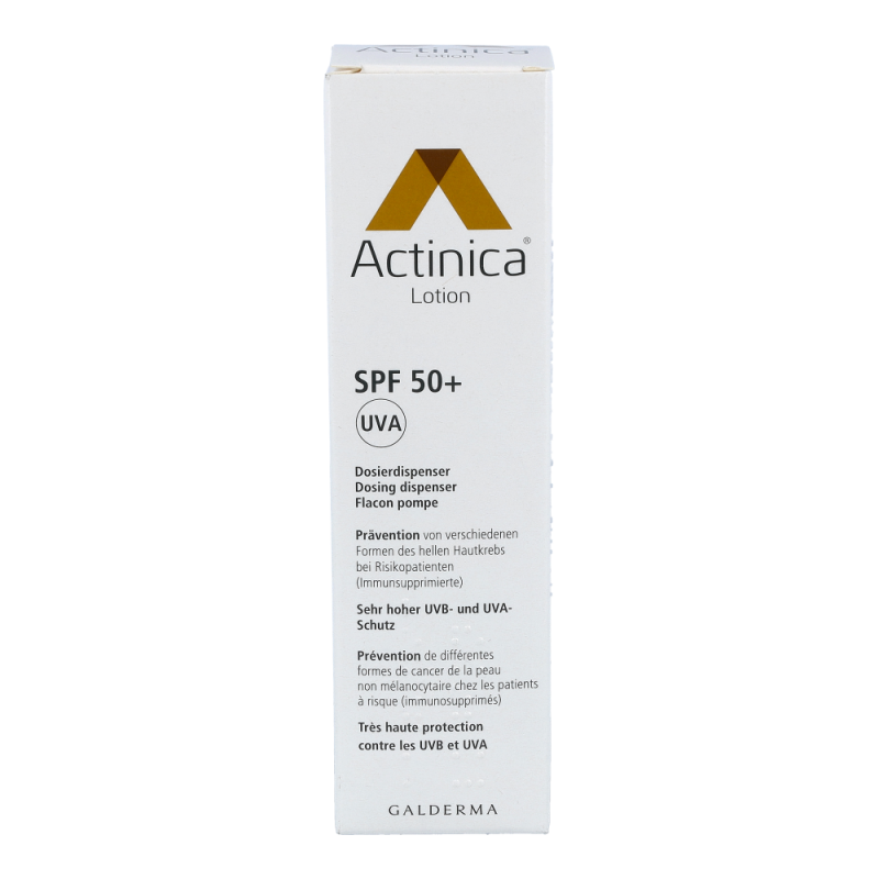 Galderma Actinica Lotion mit Dispenser 80 g ist ein Medizinprodukt mit sehr hohem UV-Schutz und wurde speziell für Personen entwickelt, welche ein erhöhtes Risiko für die Entwicklung von Hellem Hautkrebs aufweisen. Actinica® Lotion enthält eine Kombination moderner photostabiler UV-Filter, die ein breites Spektrum der UV-Strahlung abdecken. Die Lotion schützt zuverlässig sowohl für UV-B- als auch vor UV-A-Strahlen und ihre Wirksamkeit in der Prävention des Hellen Hautkrebs wurde bei Risikopatienten in einer klinischen Studie belegt