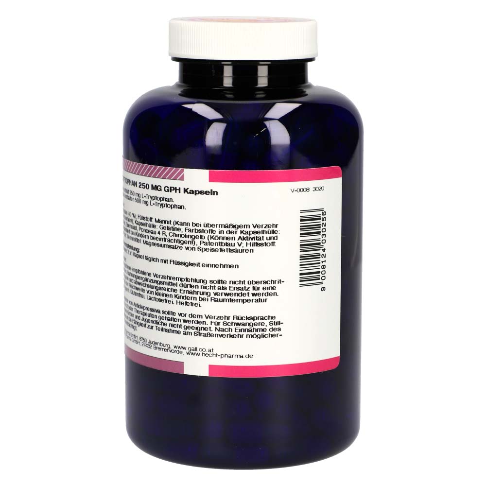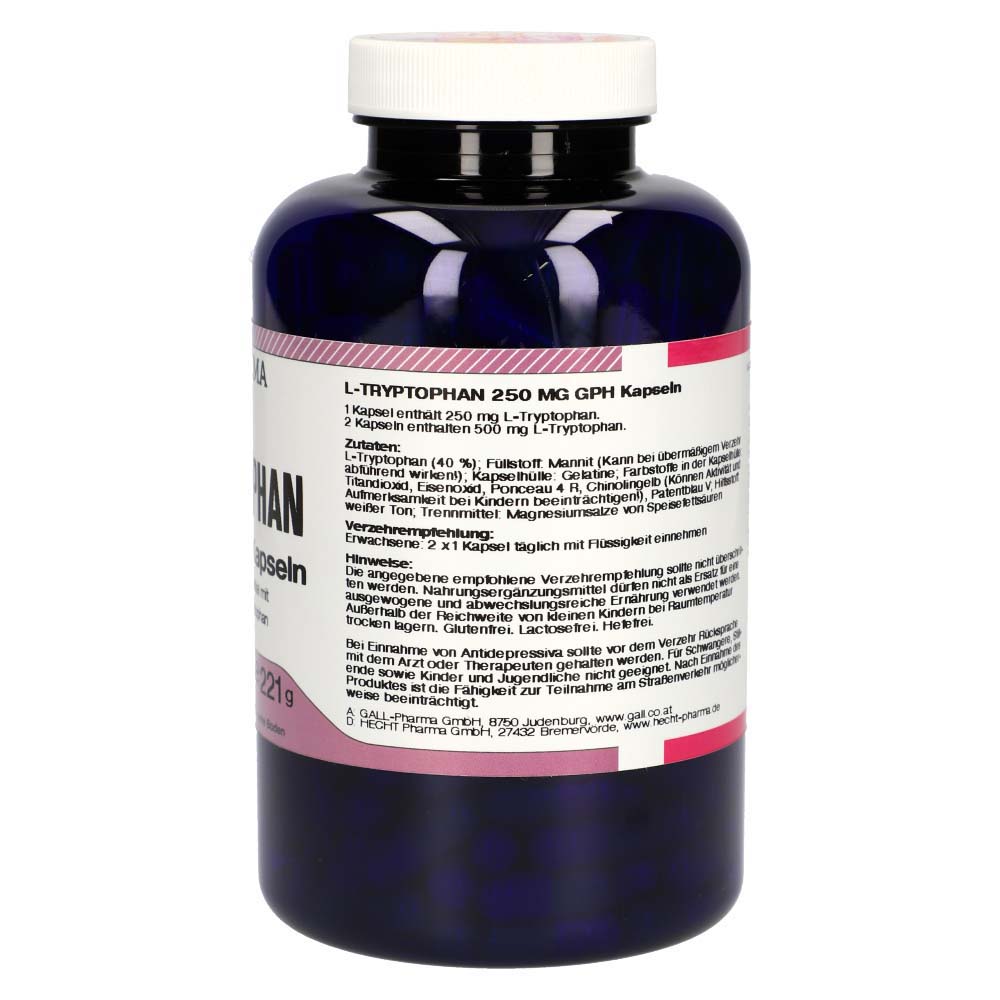 Gall Pharma L-Tryptophan 250 mg Kapseln enthalten 250 mg L-Tryptophan in einer Hartgelatinekapsel. 3 % des gewöhnlichen L-Tryptophans wird im Körper, wenn es eingenommen wird, zu Serotonin umgewandelt. Serotonin ist verantwortlich für innere Ruhe, Ausgeglichenheit und für Glücksgefühle. Dieses Hormon stellt somit einen Stressregulator dar. Dieses Produkt ist in Packungen zu 60, 120, 180 und 360 Stück erhältlich.