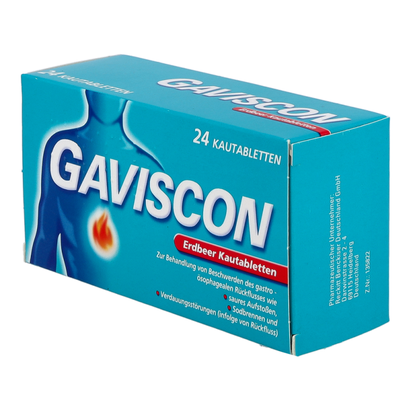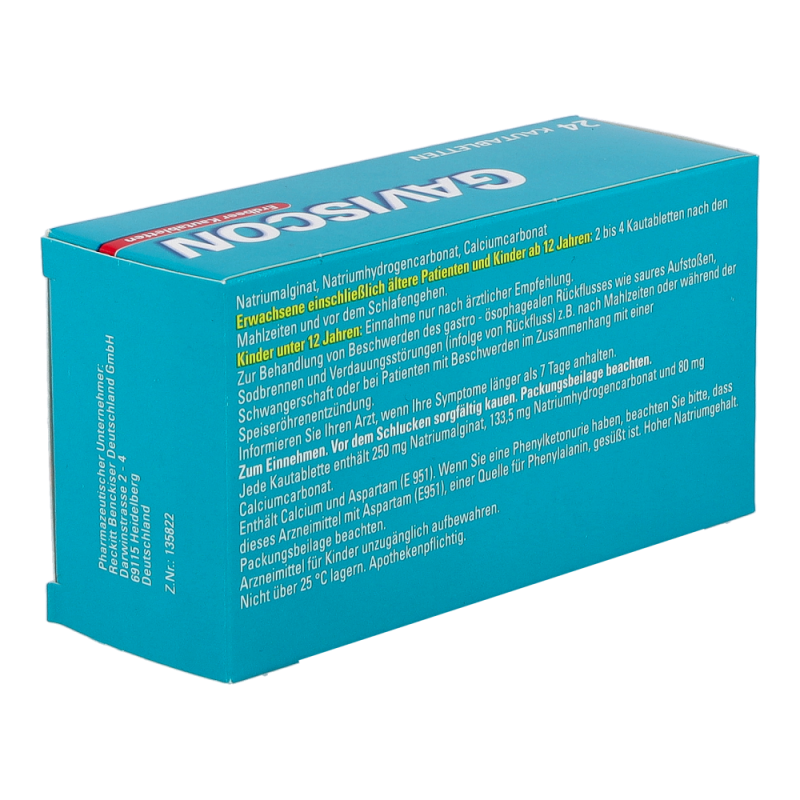 Erwachsene und Kinder ab 12 Jahren: 2 – 4 Tabletten nach den Mahlzeiten und vor dem Schlafengehen, bis zu 4x täglich. Gaviscon ist frei von Zucker, Lactose, Gluten und Farbstoffen und kann von Diabetikern eingenommen werden.