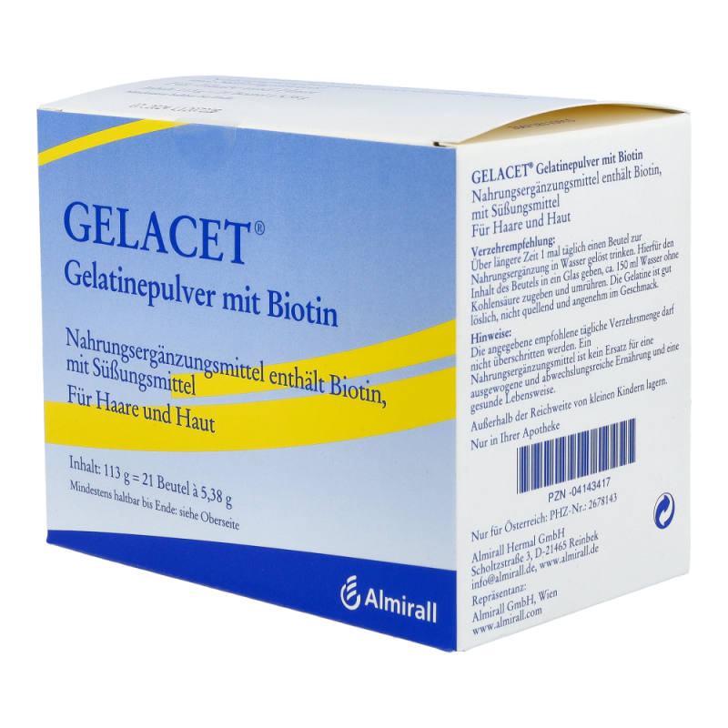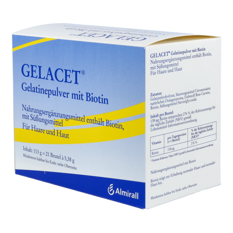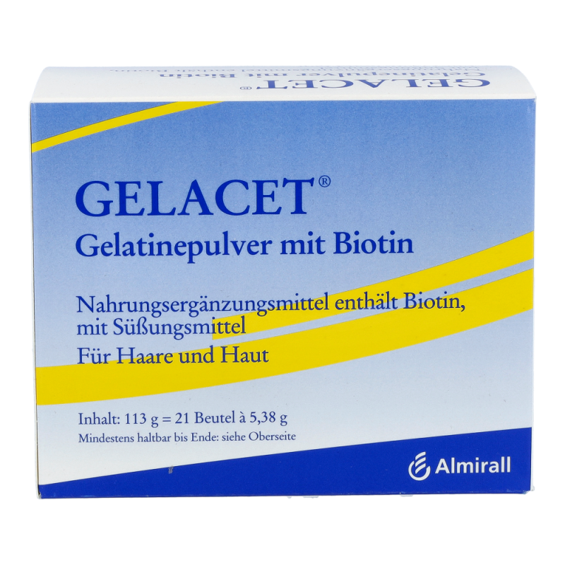 Gelacet Pulver + Biotin Beutel sorgt für eine angemessene Zufuhr von Biotin, welches eine große Rolle für Haare, Haut und Nägel spielt. Es fördert das Wachstum von Zellen und schützt diese vor äußeren Einflüssen.