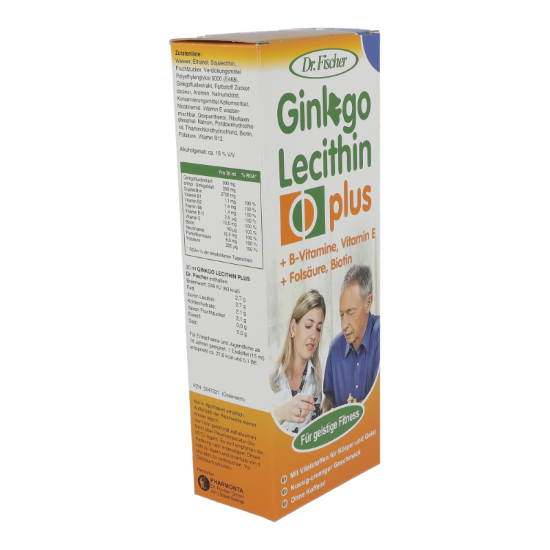 "100 ml GINKGO LECITHIN PLUS Dr. Fischer enthalten: Brennwert: 769 KJ (184 kcal) Eiweiß: 0 g Kohlenhydrate: 7 g Fett: 9 g Zutatenliste: Wasser, Ethanol, Sojalecithin, Fruchtzucker, Verdickungsmittel Polyethylenglykol 6000 (E468), Ginkgofluidextrakt, Farbstoff Zuckercouleur, Aromen, Natriumcitrat, Konservierungsmittel Kaliumsorbat, Nicotinamid, Vitamin E wassermischbar, Dexpanthenol, Riboflavinphosphat-Natrium, Pyridoxinhydrochlorid, Thiaminchloridhydrochlorid, Biotin, Folsäure und Vitamin B12. Alkoholgehalt: ca. 16 % V/V"