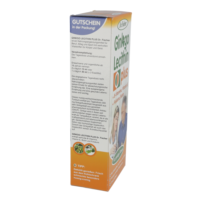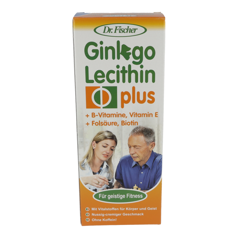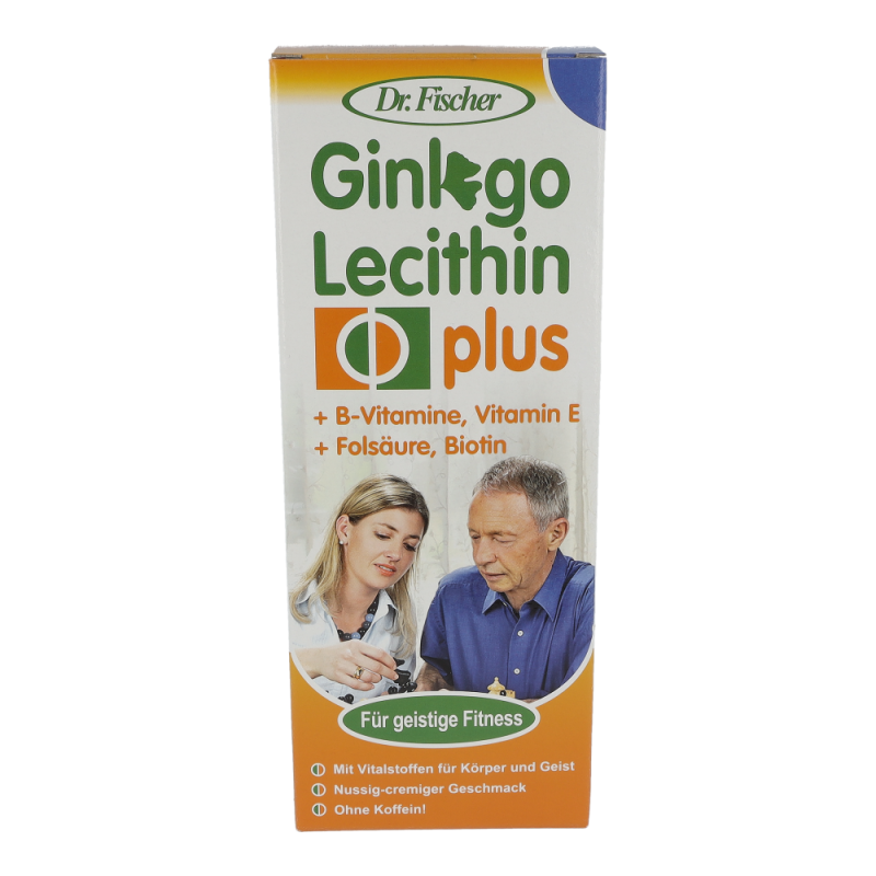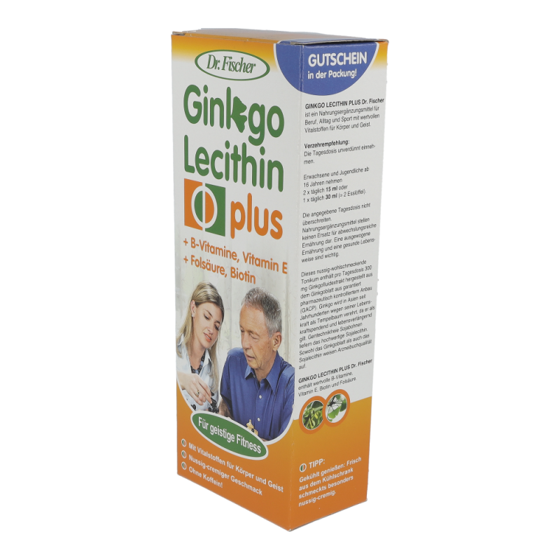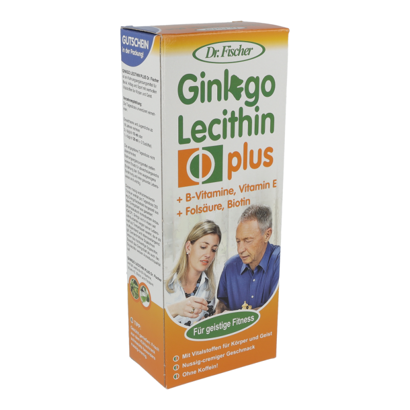 "Nahrung fürs Gehirn! GINKGO LECITHIN PLUS Dr. Fischer ist ein Nahrungsergänzungsmittel für Beruf, Alltag und Sport mit wertvollen Vitalstoffen für Körper und Geist. + B-Vitamine + Vitamin E + Folsäure + Biotin Dieses nussig-wohlschmeckende Tonikum enthält pro Tagesdosis 300 mg Ginkgofluidextrakt hergestellt aus garantiert pharmazeutisch kontrolliertem Anbau (GACP). Ginkgo wird in Asien seit Jahrhunderten wegen seiner Lebenskraft als Tempelbaum verehrt, da er als kraftspendend und lebensverlängernd gilt. Gentechnikfreie Sojabohnen liefern das hochwertige Sojalecithin. Sowohl das Ginkgoblatt als auch das Sojalecithin weisen Arzneibuchqualität auf. GINKGO LECITHIN PLUS Dr. Fischer enthält auch noch wertvolle B-Vitamine, Vitamin E, Biotin und Folsäure."