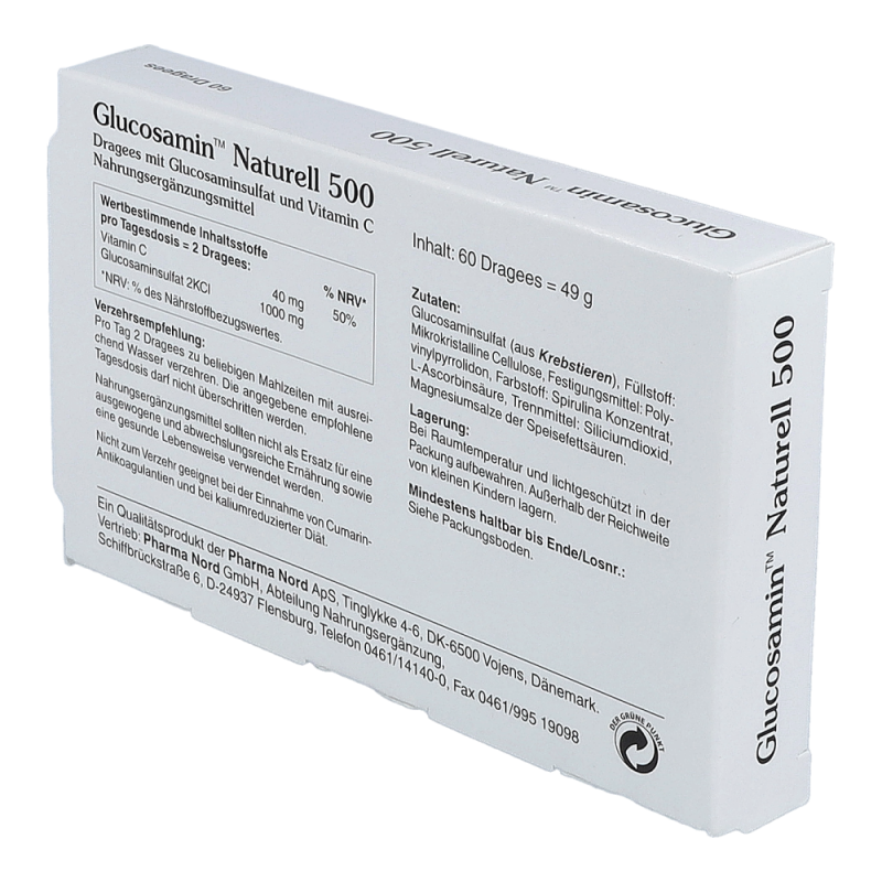 Glucosamin Naturell 500 ist ein Nahrungsergänzungsmittel zur Unterstützung von Knorpel und Knochen. Die tägliche Belastung der Gelenke kann mit der Zeit zu Verschleißerscheinungen führen. Achten Sie daher ein Leben lang auf Ihre Gelenke! Jedes Glucosamin-Dragee enthält 500 mg Glucosaminsulfat, das zur Erhaltung der gesunden Gelenkfunktion beitragen kann. Neben Glucosamin, einem natürlich vorkommenden Zucker Molekül enthält das Produkt Vitamin C, das zu einer normalen Kollagenbildung und zu einer normalen Funktion von Knochen und Knorpel beiträgt.