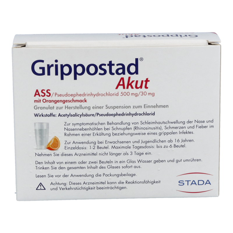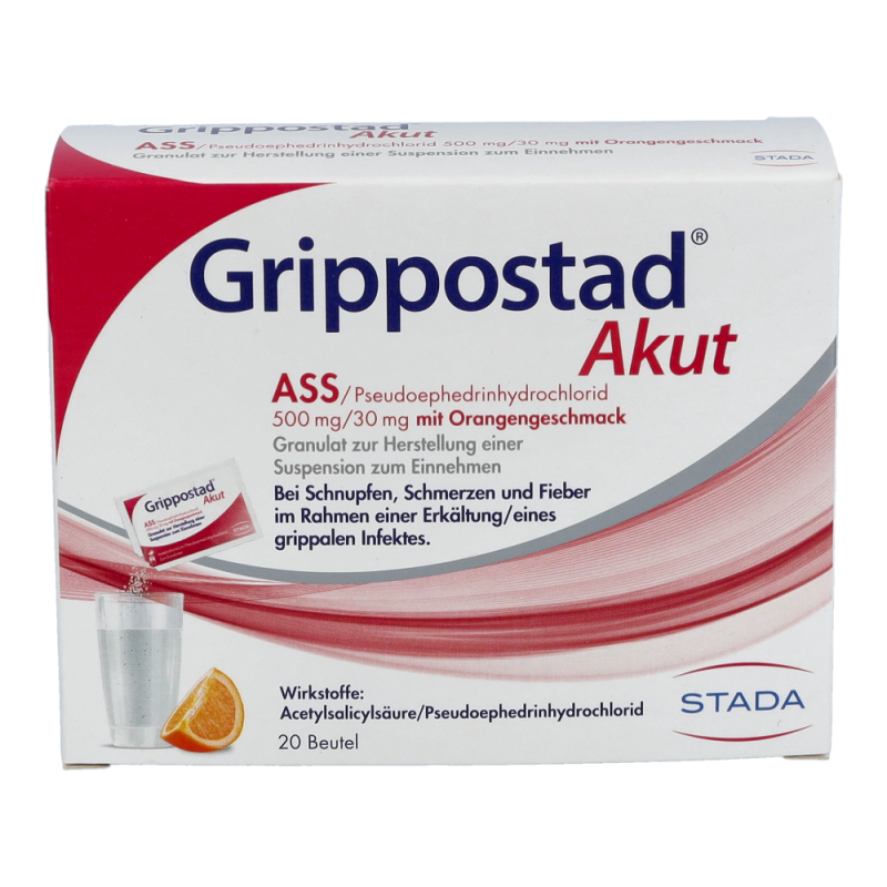 Die Wirkstoffkombination von Grippostad® Akut besteht aus 30mg Pseudoephedrinhydrochlorid, das durch ein schnelles Abschwellen der Schleimhäute in Nase und Nasennebenhöhlen für Linderung der verstopften Nase sorgen kann. Ergänzend dazu kann das Grippostad® Akut zum Auflösen dank 500mg Acetylsalicylsäure (ASS) erkältungsbedingte Schmerzen lindern, Entzündungen hemmen und das Fieber senken.