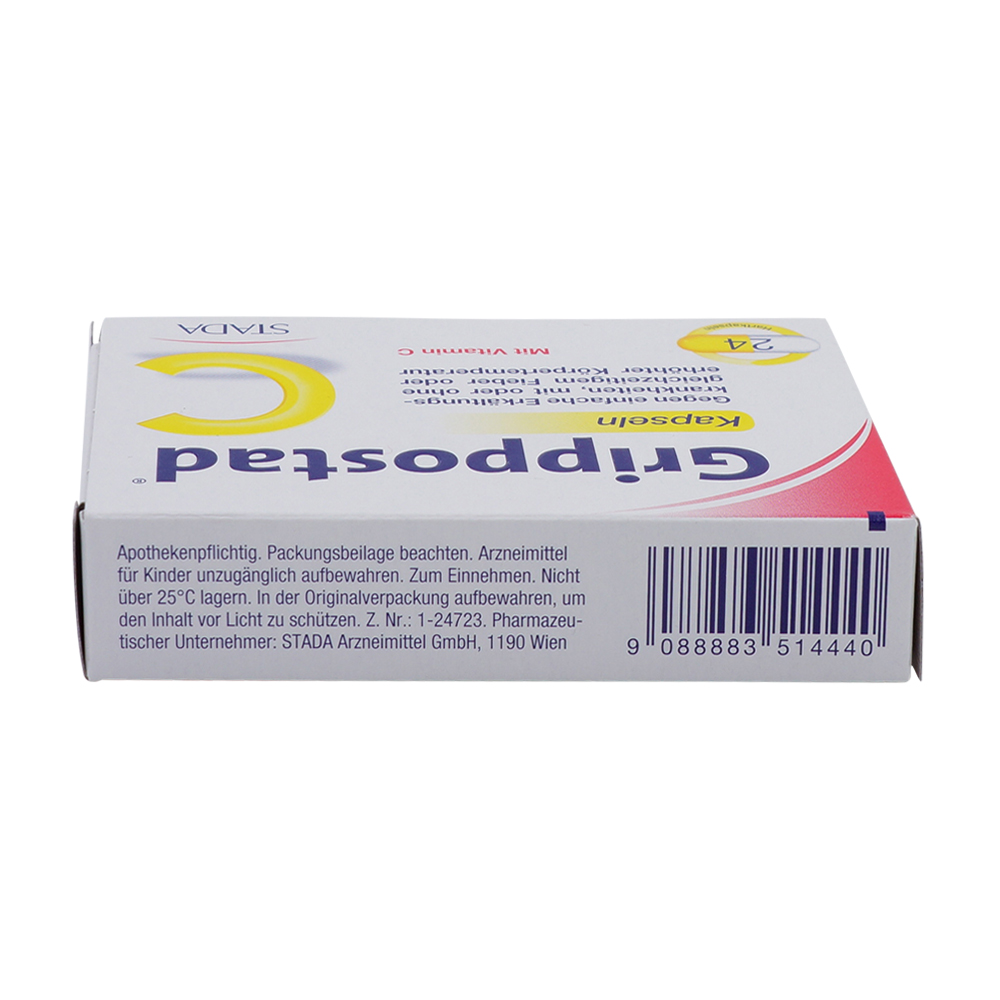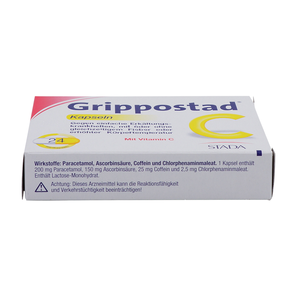 Grippostad® C Kapseln bieten mit der innovativen 4er-Wirkstoffkombination Paracetamol, Chlorphenamin, Coffein und Ascorbinsäure (Vit. C) schnelle Hilfe beigrippalen Infekten und Erkältungskrankheiten verbunden mit Fieber. Paracetamol wirkt schmerzlindernd und fiebersenkend, Chlorphenamin trägt zur Abschwellung der Nasenschleimhaut bei und lindert Reizhusten, Coffein verstärkt die schmerzstillende Wirkung von Paracetamol und Vitamin C unterstützt das Immunsystem.