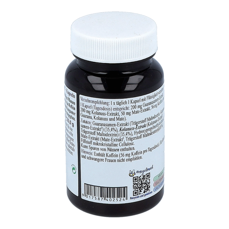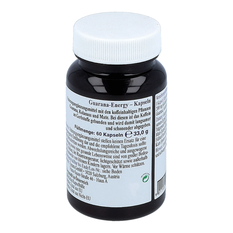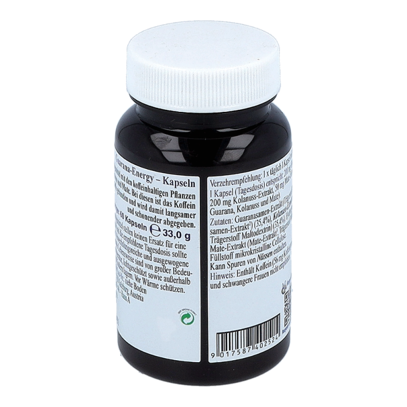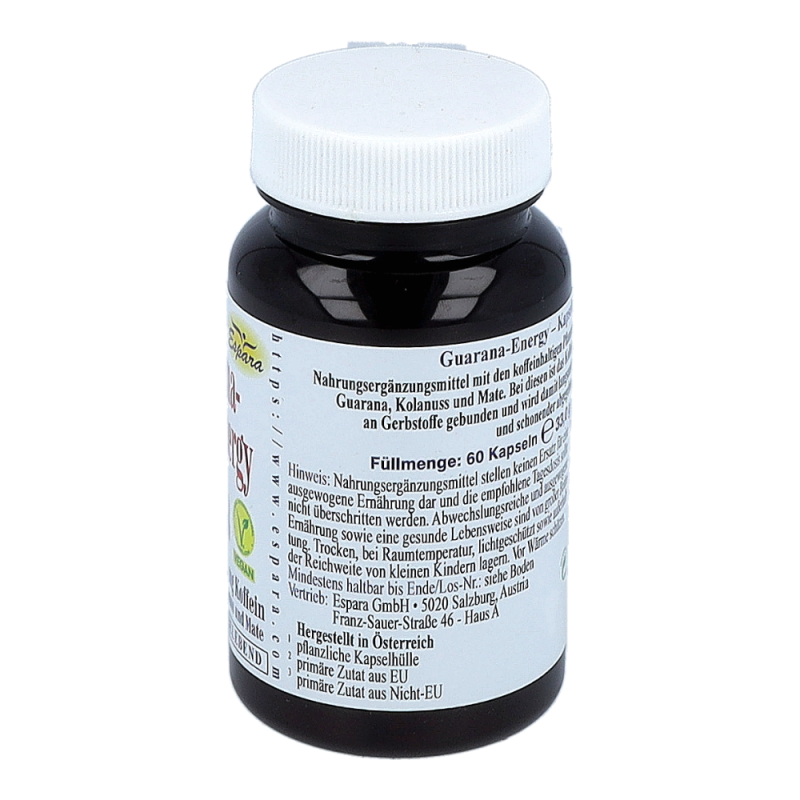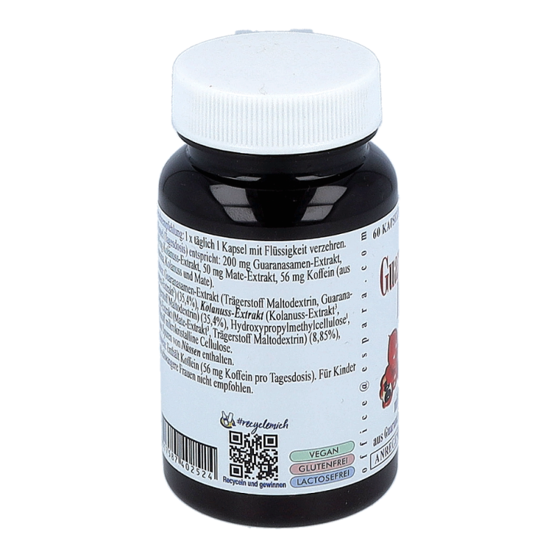 Die Guarana Energy Kapseln sind ein Nahrungsergänzungsmittel bestehend aus dem Extrakt der Guaranapflanze, Kolanuss und Mate. Durch den natürlichen koffeingehalt der Guaranapflanze verhelfen die Kapseln zu mehr Energie und Auftrieb und verringern Müdigkeit. Durch den hohen Anteil an Gerbstoffen und sekundären Pflanzenstoffen wird die Wirkung des enthaltenen natürlichen Koffeins nach und nach abgegeben, dadurch hält die sanft anregende und leistungssteigernde Wirkung mehrere Stunden an.