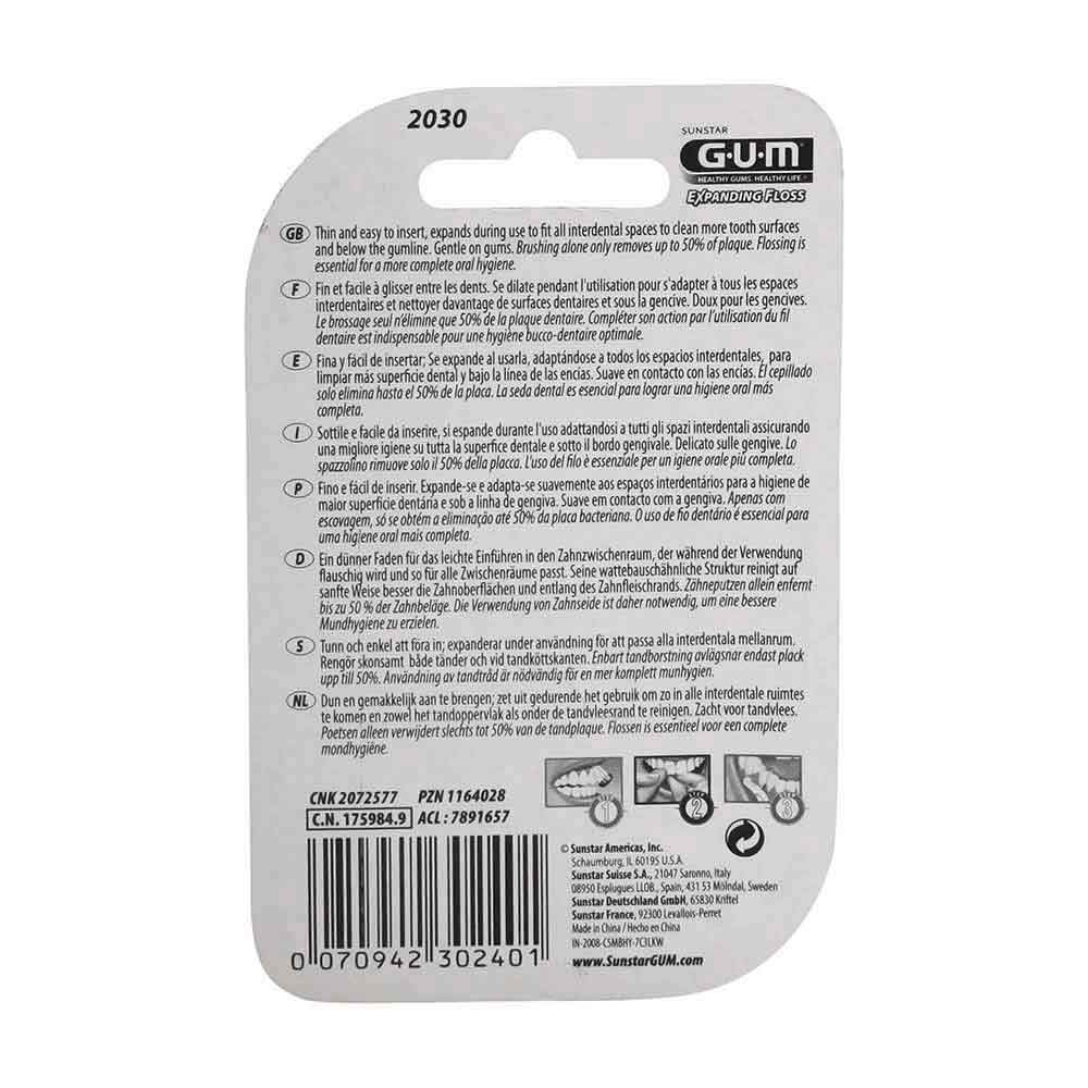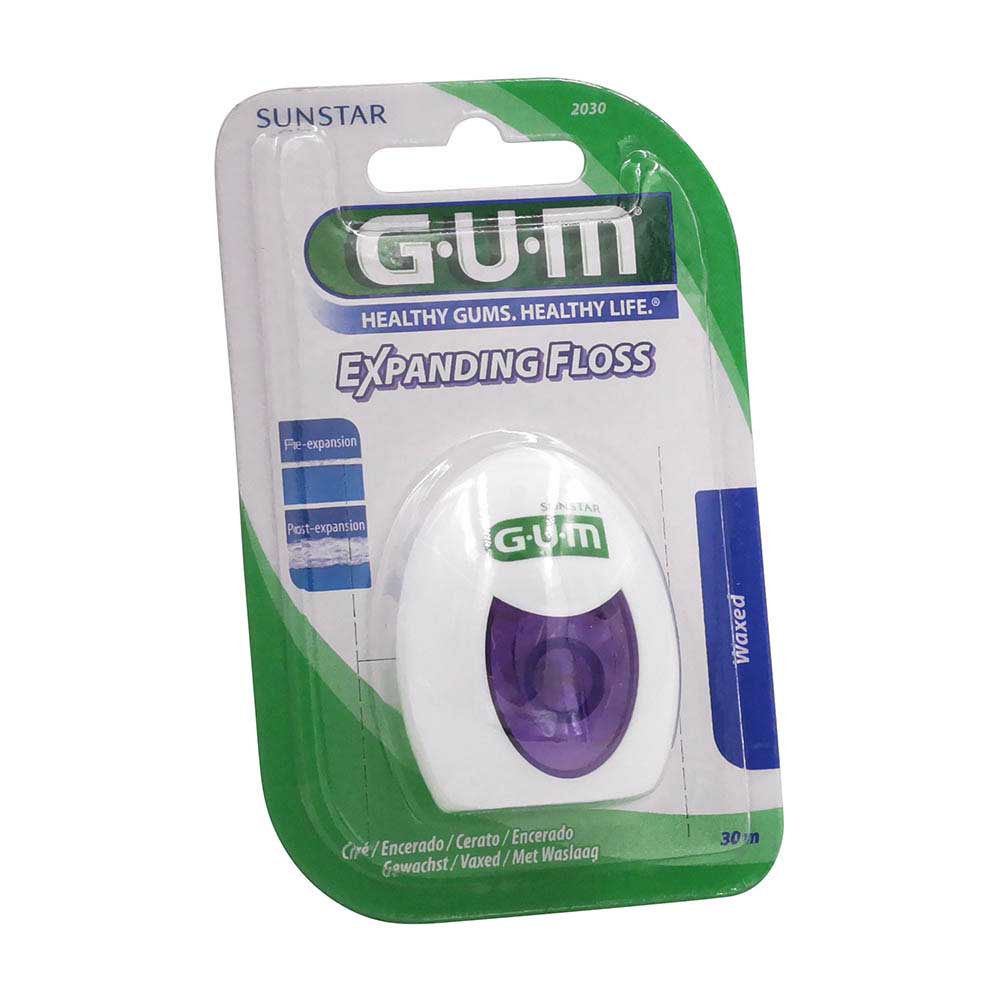 GUM® Expanding Floss Zahnseide – 30 m dünne, leicht gewachste Zahnseide, die sich leicht auch in engeZahnzwischenräume einführen lässt.Während des Verwendens wird die Zahnseide flauschig und passtsich so den variierenden Interdentalräumen an.Die wattebauschähnliche Struktur ist sanft zum Zahnfleisch,perfekt für sensible Zähne und empfi ndliches Zahnfleisch.