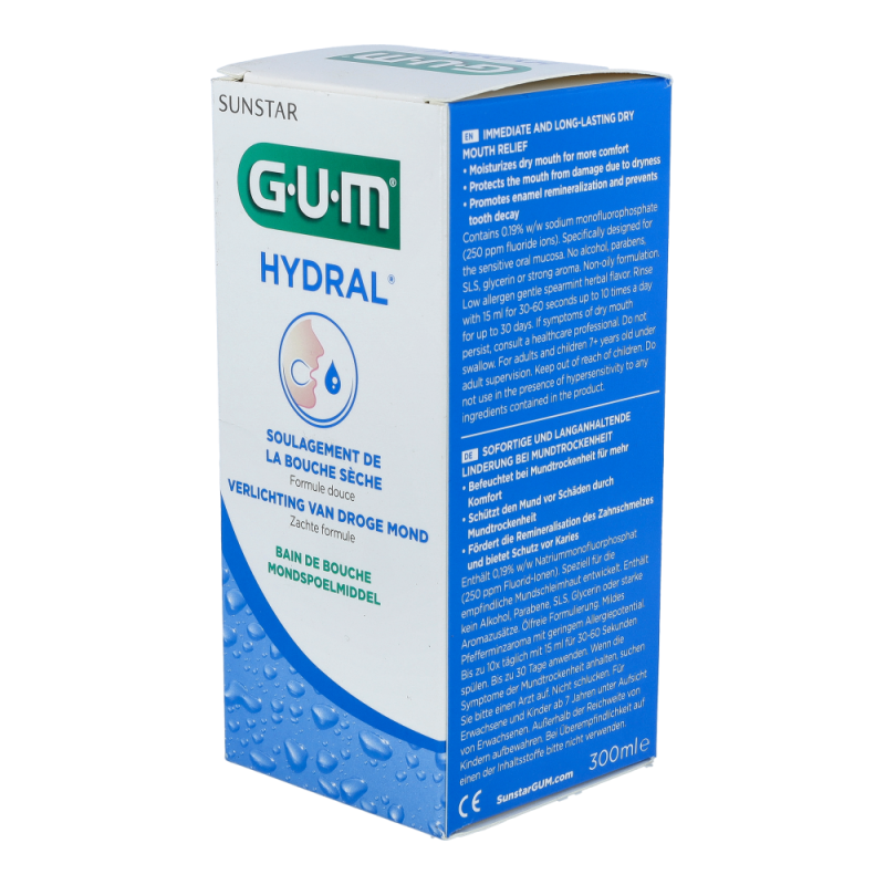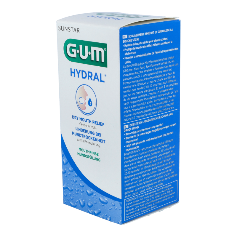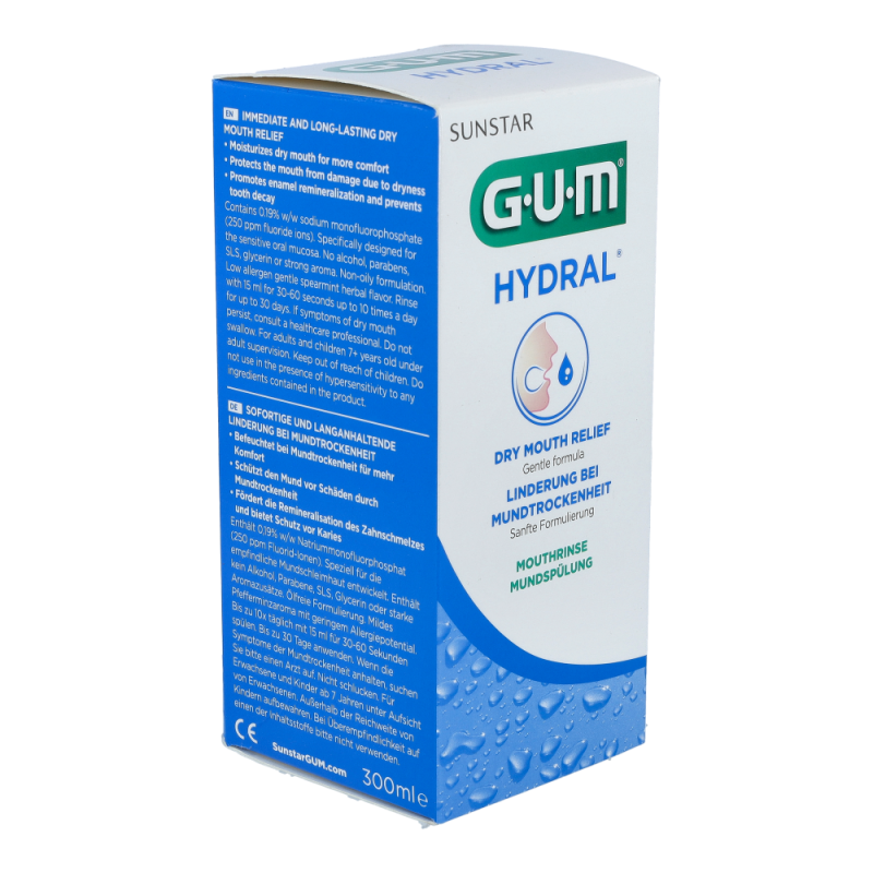 Gum Hydral Mundspülung bietet sofortige und langanhaltende Linderung bei Mundtrockenheit. Die Sülung ist ideal zur Einbindung in die tägliche Mund- und Zahnpflege geeignet und kann bis zu 5 mal täglich angewendet werden. Sie dient zur Unterstützung der Zahnschmelzremineralisation und zum Schutz vor Karies. Benetzt das orale Gewebe für zusätzliche Befeuchtung und Komfort dank der höheren Viskosität.