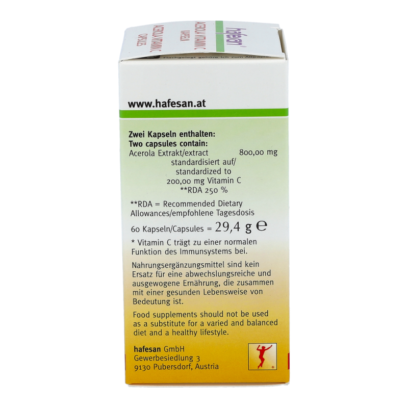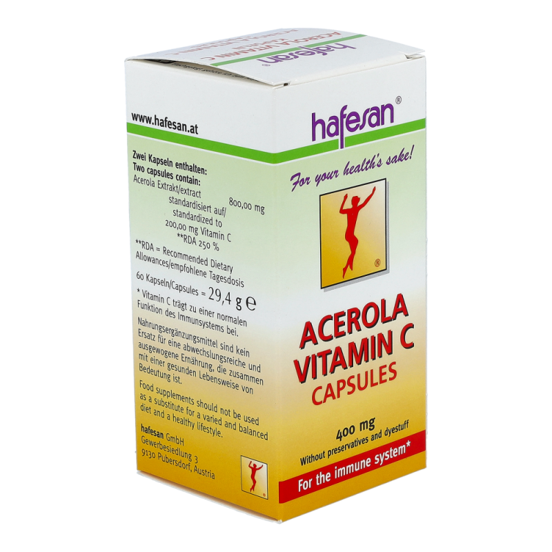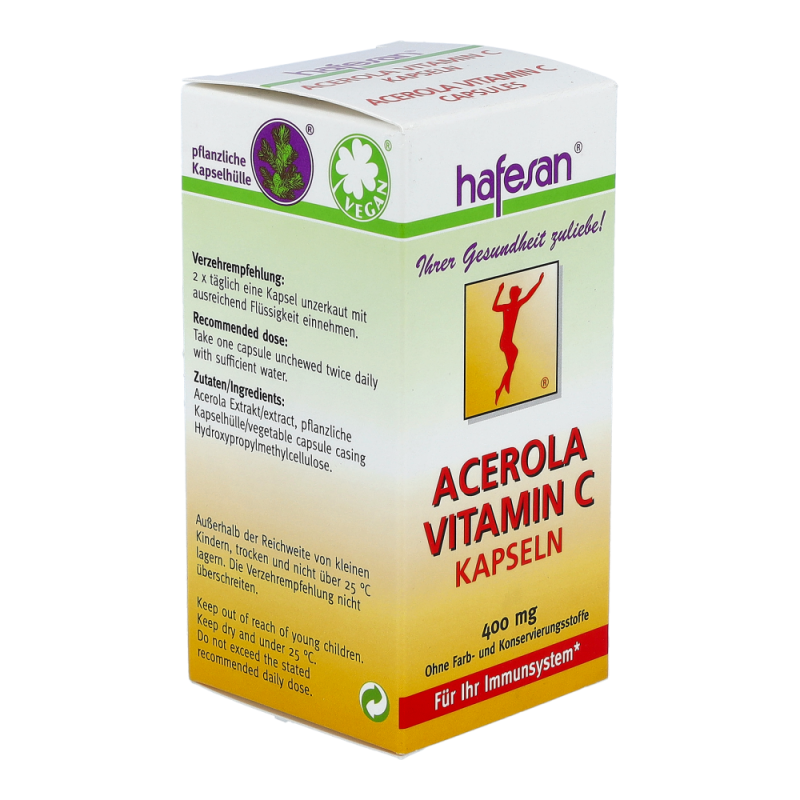 hafesan Acerola Vitamin C versorgt Ihren Körper mit natürlichem Vitamin C aus der Acerolakirsche. Gerade im Winter, bei Rauchern, in Stress-Situationen und bei hoher körperlicher Belastung steigt der Vitamin C Bedarf