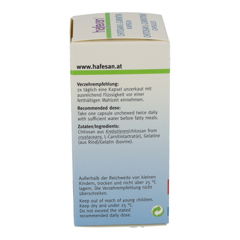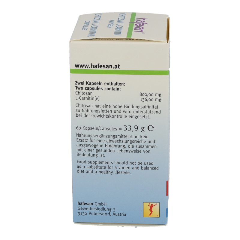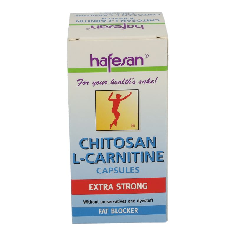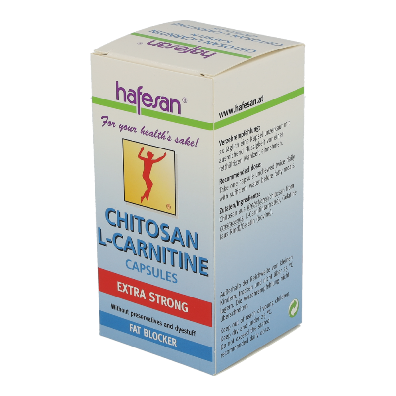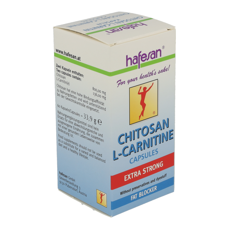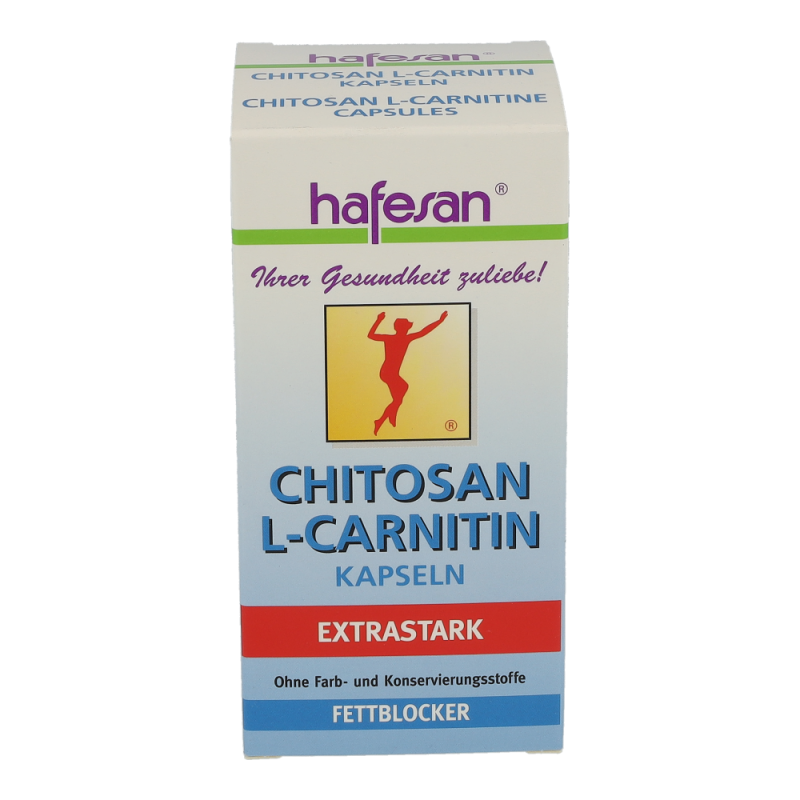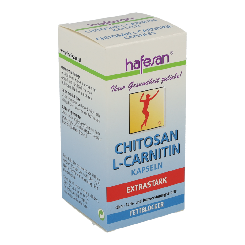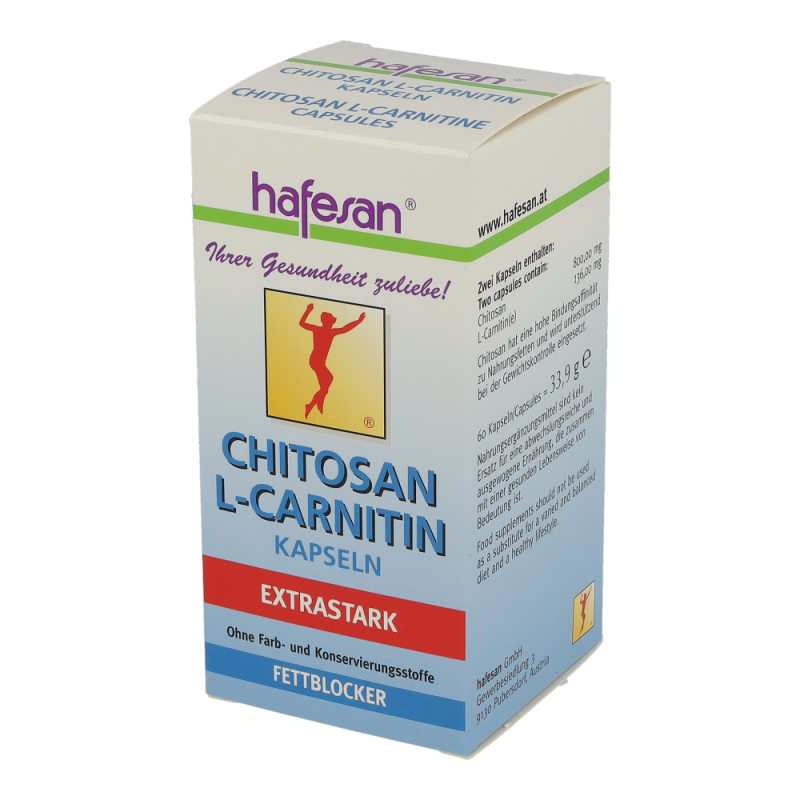 hafesan Chitosan + L-Carnitin Kapseln zur unterstützung Ihrer Diät. Die Kapseln ziehen das Fett aus der Nahrung an und binden es sodass es der Köprer nicht aufnehmen kann. Dadurch wird auf die eigenen Fettreserven zurückgegriffen und lästige Pölsterchen und Schwimmreifen werden abgegbaut..